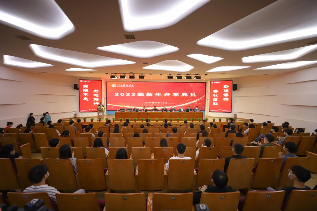 新闻中心讯(文/万强 图/万强 黄珊 杜金晔)金秋十月,丹桂飘香,在全国上下喜迎党的二十大胜利召开之际,10月18日下午,我校在思贤楼三楼报告厅隆重举行2022级新生开学典礼。典礼采取线下+线上的方式举行。校长薛家宝,党委书记陈付龙,副理事长涂燕萍,党委副书记、副校长李宝君,副校长陈东生、刘孜杰,党委副书记唐新强,校领导李沛武,校长助理马国照出席典礼并在主席台就坐。相关职能部门负责人、各学院负责人、教师代表、2022级新生代表参加典礼。典礼由党委副书记、副校长李宝君主持。
