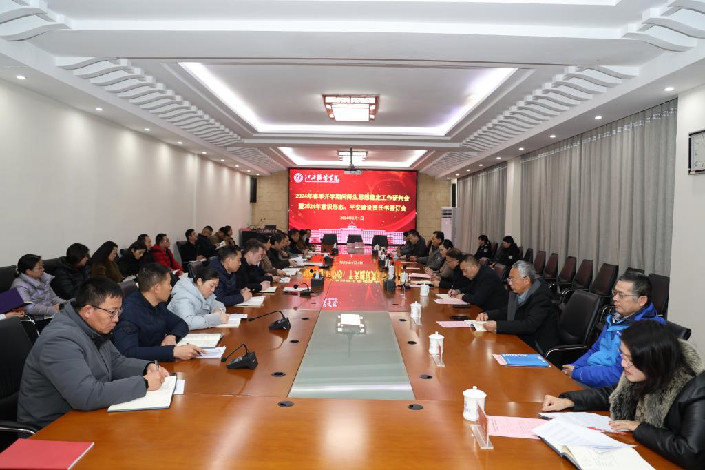 会上,宣传部部长沈新建通报传达了2023年全省教育系统意识形态领域情况和2024年意识形态工作研判、上半年重要时段和敏感节点风险隐患提示;保卫处处长鲍鹏通报了2023年度平安建设落实情况、传达2024年上级文件精神、部署平安校园建设工作;统战部部长陈翠娥通报了2023年度统战工作落实情况及部署2024年工作;教师工作部部长曾冬秀通报了2023年度师德师风工作落实情况及部署2024年工作;学工部部长邓良峰通报了新学期学生思想动态情况。