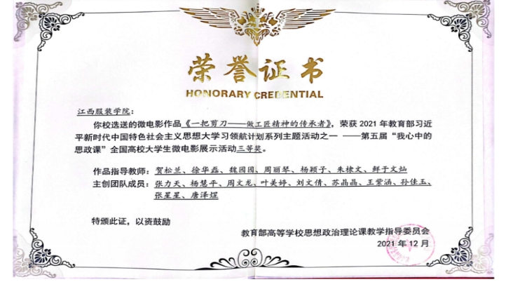 近日,由教育部高等学校思想政治理论课教学指导委员会主办、武汉大学马克思主义学院承办的“我心中的思政课” 第五届全国高校大学生微电影展示活动顺利结束。由我校马克思主义学院策划并出品、时尚传媒学院象画工作坊承制、师生共同参演的微电影作品《一把剪刀——做工匠精神的传承者》,荣获2021年习近平新时代中国特色社会主义思想大学习领航计划系列主题活动之一——第五届“我心中的思政课”全国高校大学生微电影展示活动三等奖。