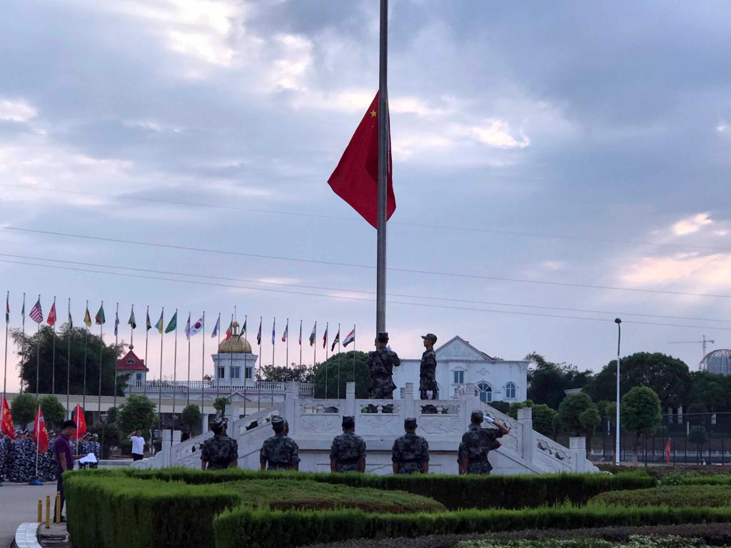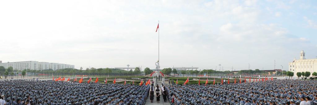 6时30分,参加仪式的全体师生在主教学楼前广场整理列队,伴随着雄壮的国歌声,升旗手振臂一挥,鲜艳的五星红旗迎风展开,全校师生面向国旗行注目礼,并高唱国歌。五星红旗迎着旭日的光辉冉冉升起,飘扬在万象城平台上空。