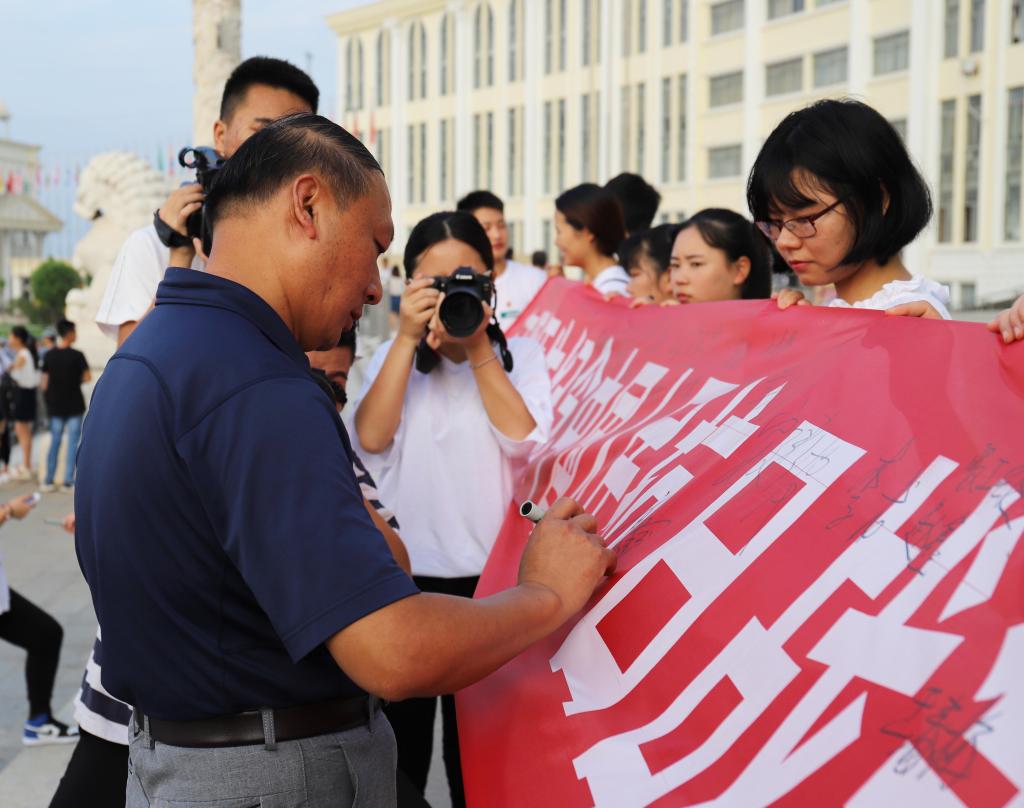 升国旗仪式结束后,师生们纷纷在“江服师生纪念中国人民抗日战争暨世界反法西斯战争胜利73周年”条幅上签名,他们将用行动铭记抗战先烈的英雄事迹,学习文化知识和军事技能。升国旗仪式在《没有共产党就没有新中国》歌声中圆满结束。
