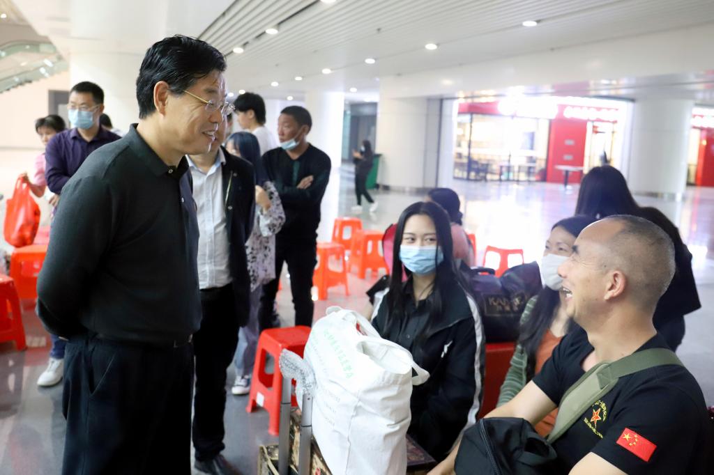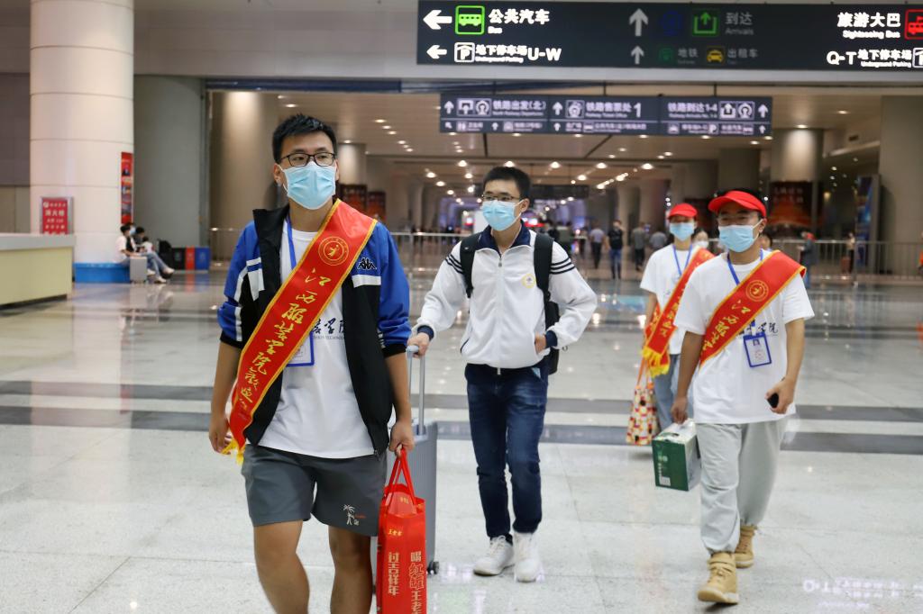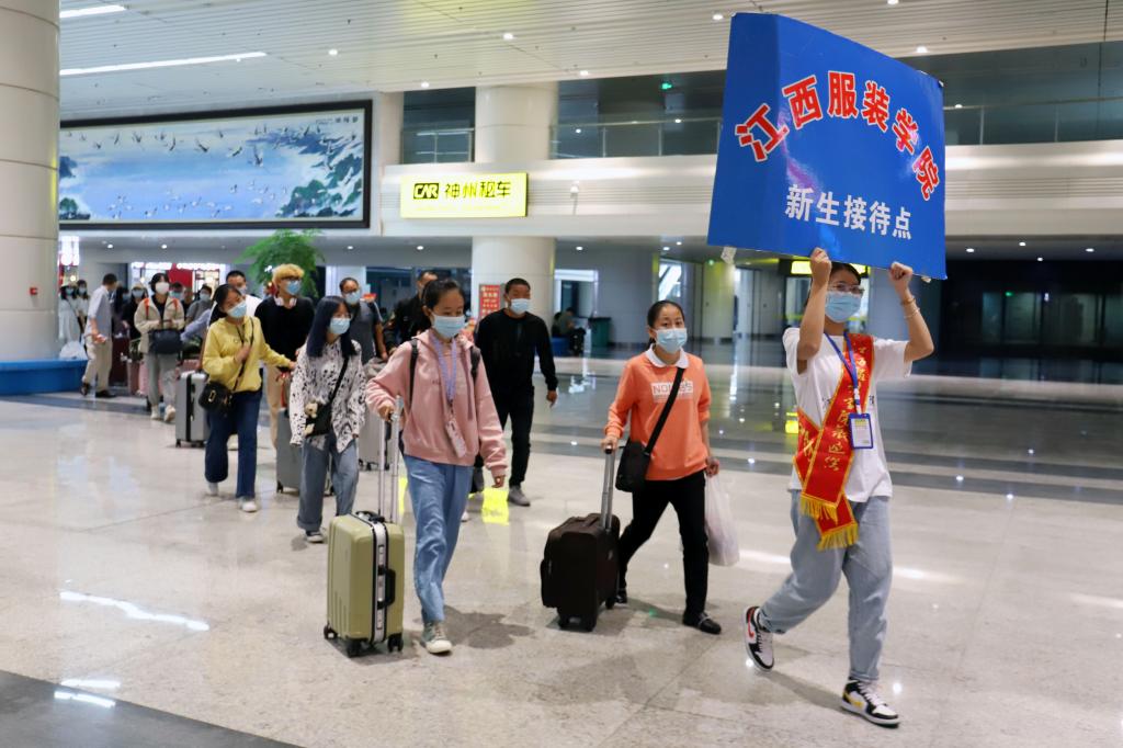 工作人员迎接新生和家长出站