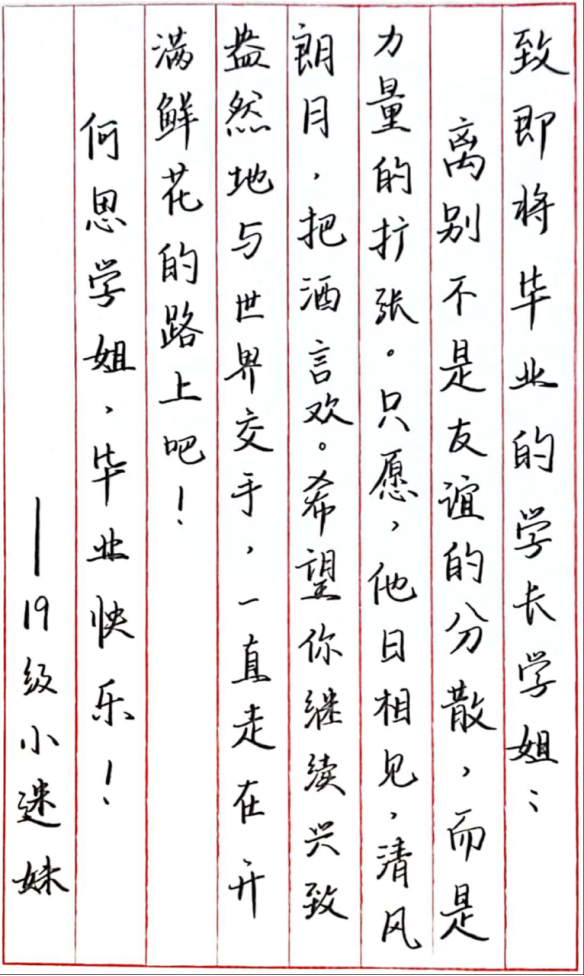 爱的表白道珍重。组织毕业生通过拍、写、绘等多种形式,书写毕业感言,总结在学校学习生活的得失,表达对母校、老师、同学情谊,为学校建校30周年送上祝福,相互道一声珍重。