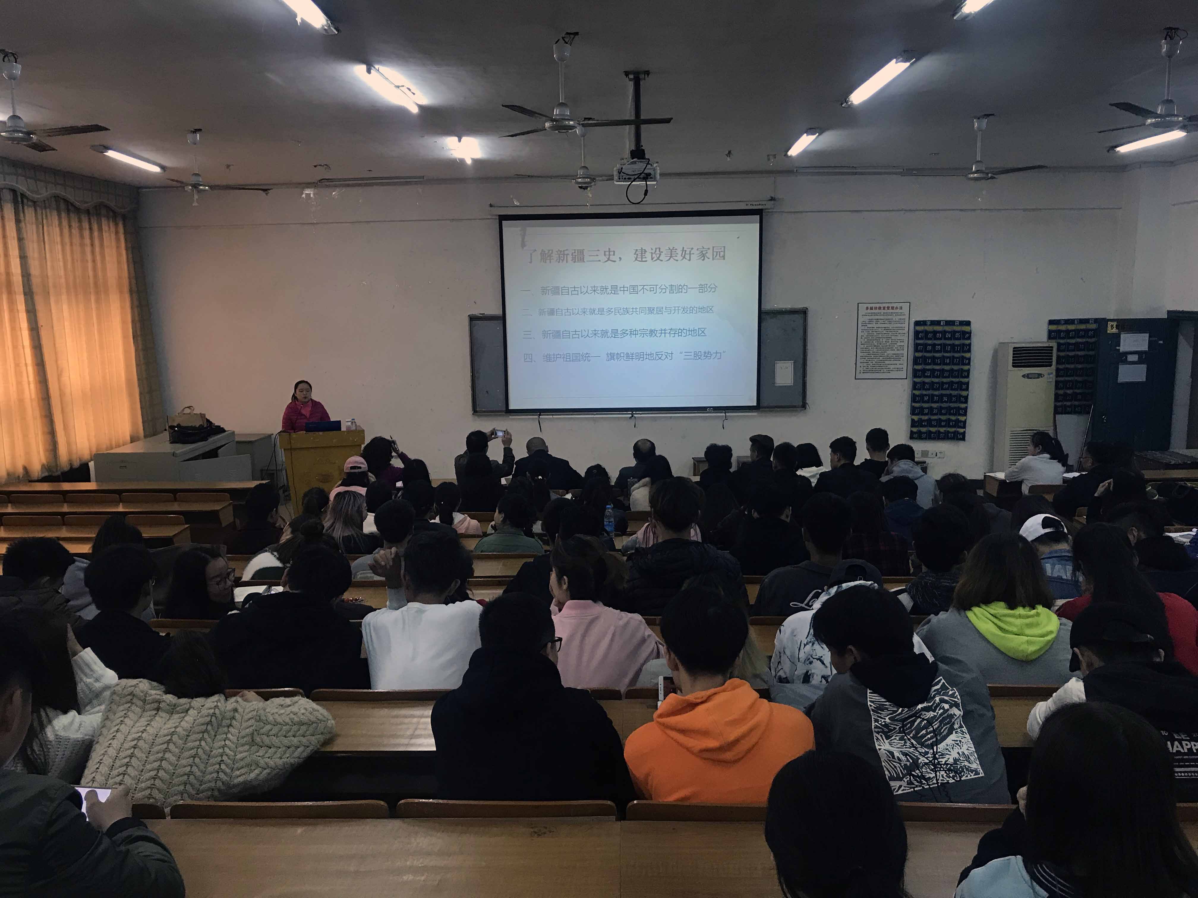 王曼老师从新疆自古以来就是中国不可分割的一部分、新疆自古以来就是多民族共同聚居与开发的地区、新疆自古以来就是多种宗教并存的地区、维护祖国统一,旗帜鲜明地反对“三股势力”等四个帮面,通过运用大量历史图文资料,深入浅出地讲述了新疆地方史、民族发展史、宗教演变史,为在座师生系统讲解了新疆的历史、人文、宗教演变过程,以及历朝历代中央政权对新疆行使主权的情况,表明新疆自古以来就是中国不可分割的一部分,新疆各民族人民都是中华民族大家庭的重要成员,有力驳斥了“三股势力”歪曲历史事实,图谋分裂祖国的罪恶行径。王老师告诫在座的同学们,作为国家公民、新疆籍大学生一定要认真学习掌握新疆的历史,构建正确的历史观和价值观,在遇到不法分子引诱和蛊惑的情况下坚定立场,明辨是非,把握正确的方向,不误入歧途。