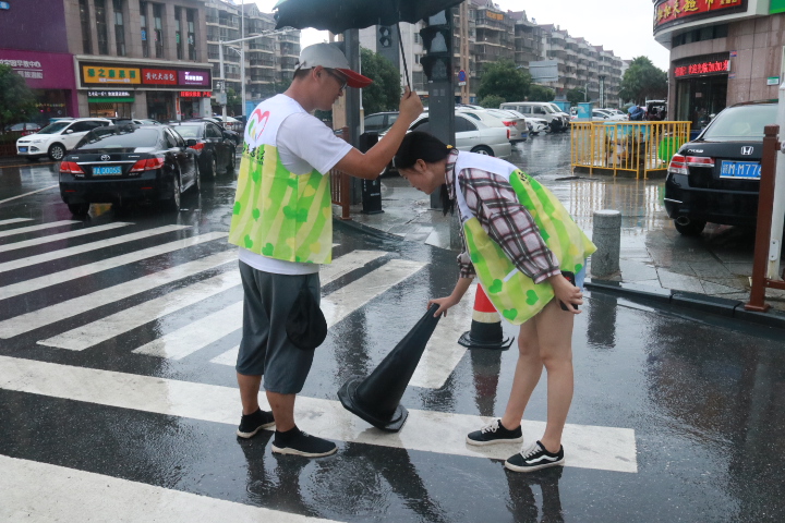 高考第二天,下起了瓢泼大雨,却依旧抵挡不住江服志愿者们的热情。志愿者们打着伞在三个服务点来回穿梭,帮助交警维持道路秩序,并积极进行爱心送暖。他们的衣服被雨水打湿,却依旧不辞辛苦努力将志愿服务做到最好,送出去的每一瓶水,每一瓶风油精,每一盒药都体现出江服志愿者浓浓的爱心。
