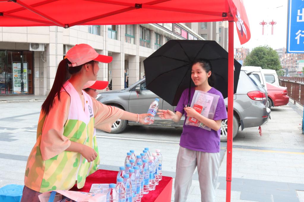 伴随着炎炎的夏日,2019年高考开始了,6月7日,考生们陆续到达考点,志愿者们也早早来到志愿服务点,把早已备好了饮用水以及防暑药品摆放整齐。志愿者们分布在考点四周,方便随时为考生服务。上午考试结束后,天气十分炎热,有些家长和考生直接坐在考场外的路旁边吃午饭,志愿者们顾不上自己吃饭,顶着烈日为考生送去矿泉水及防暑用品。结束之后志愿者席地而坐,一边吃饭一边分享着自己的收获。