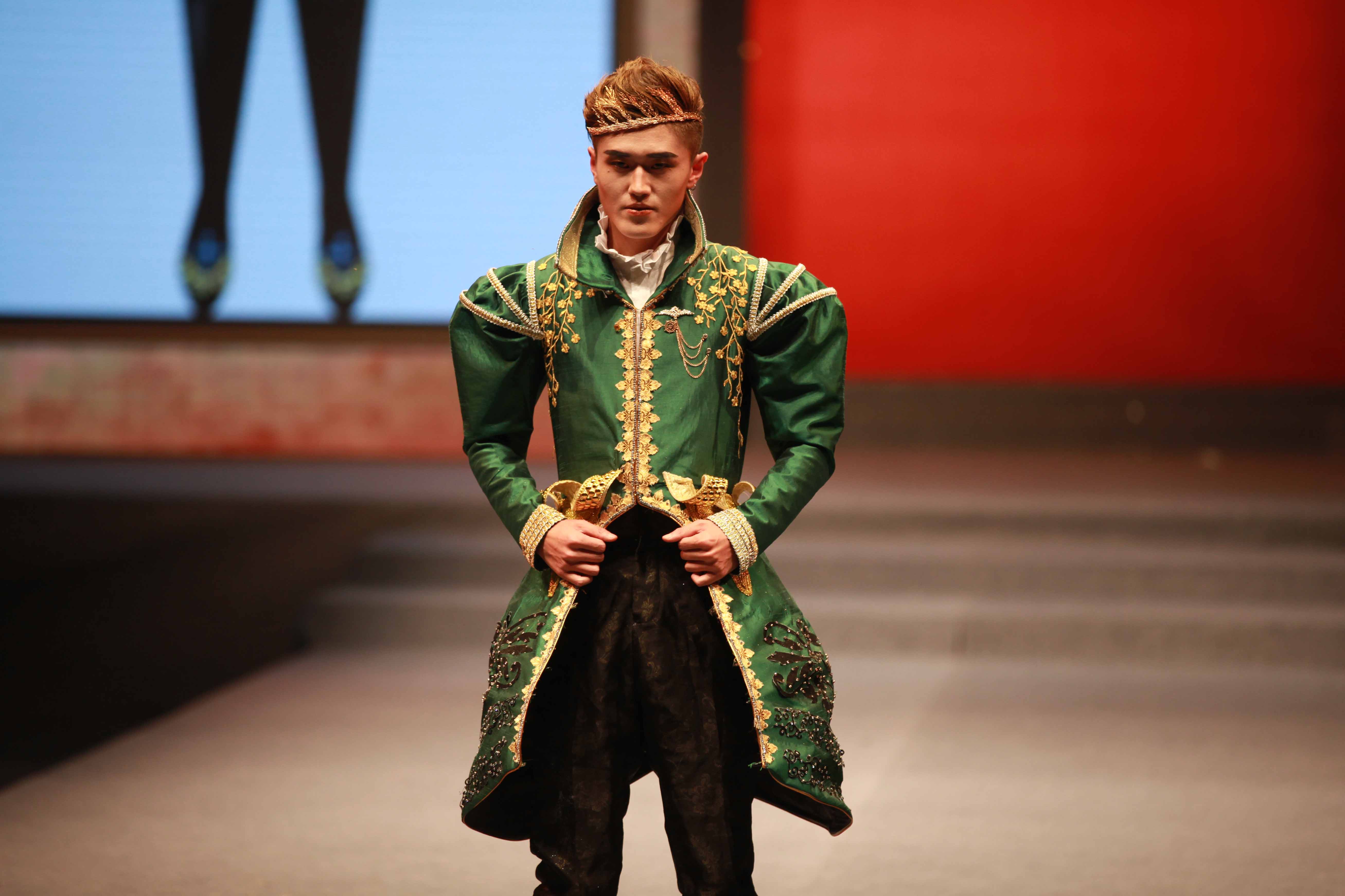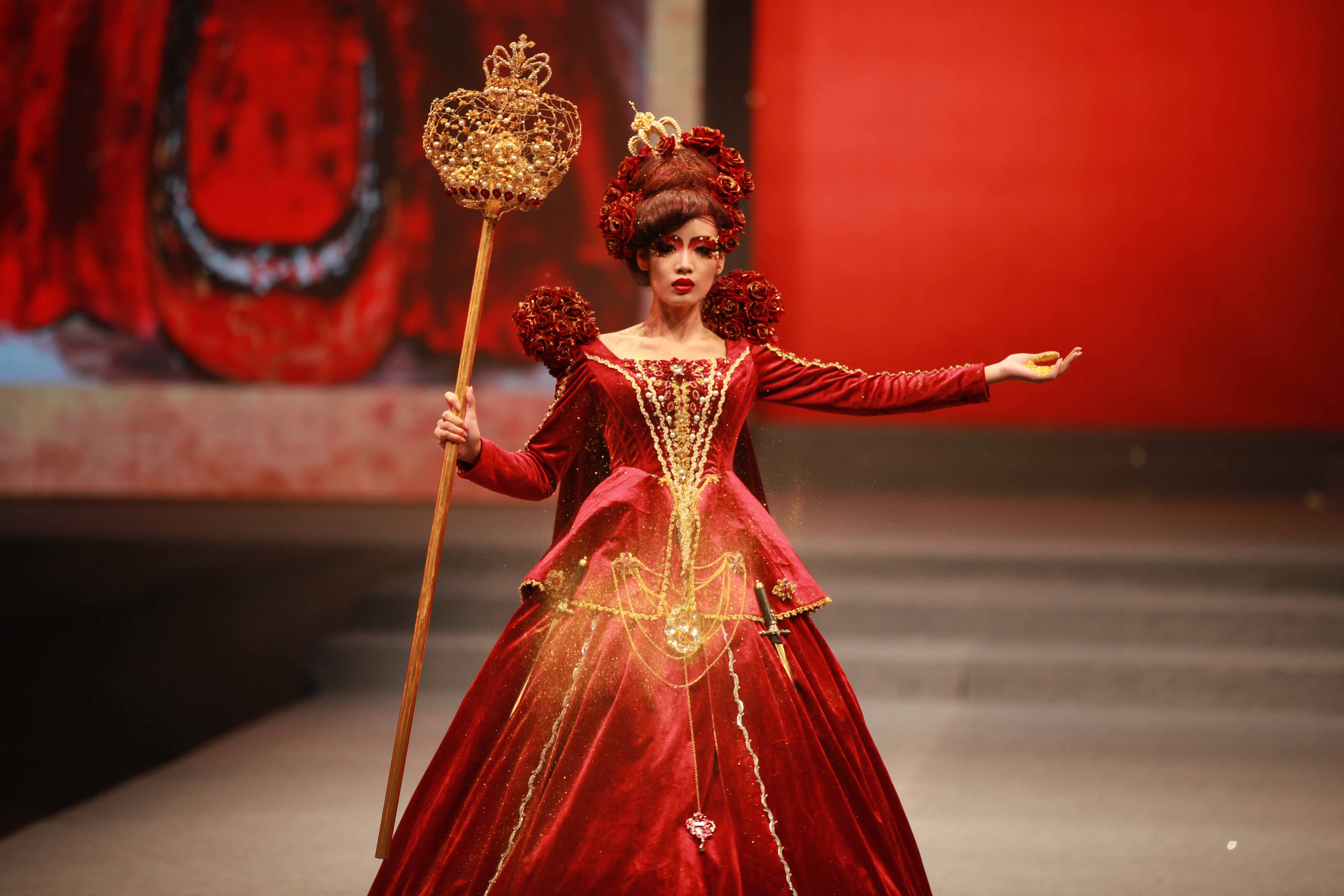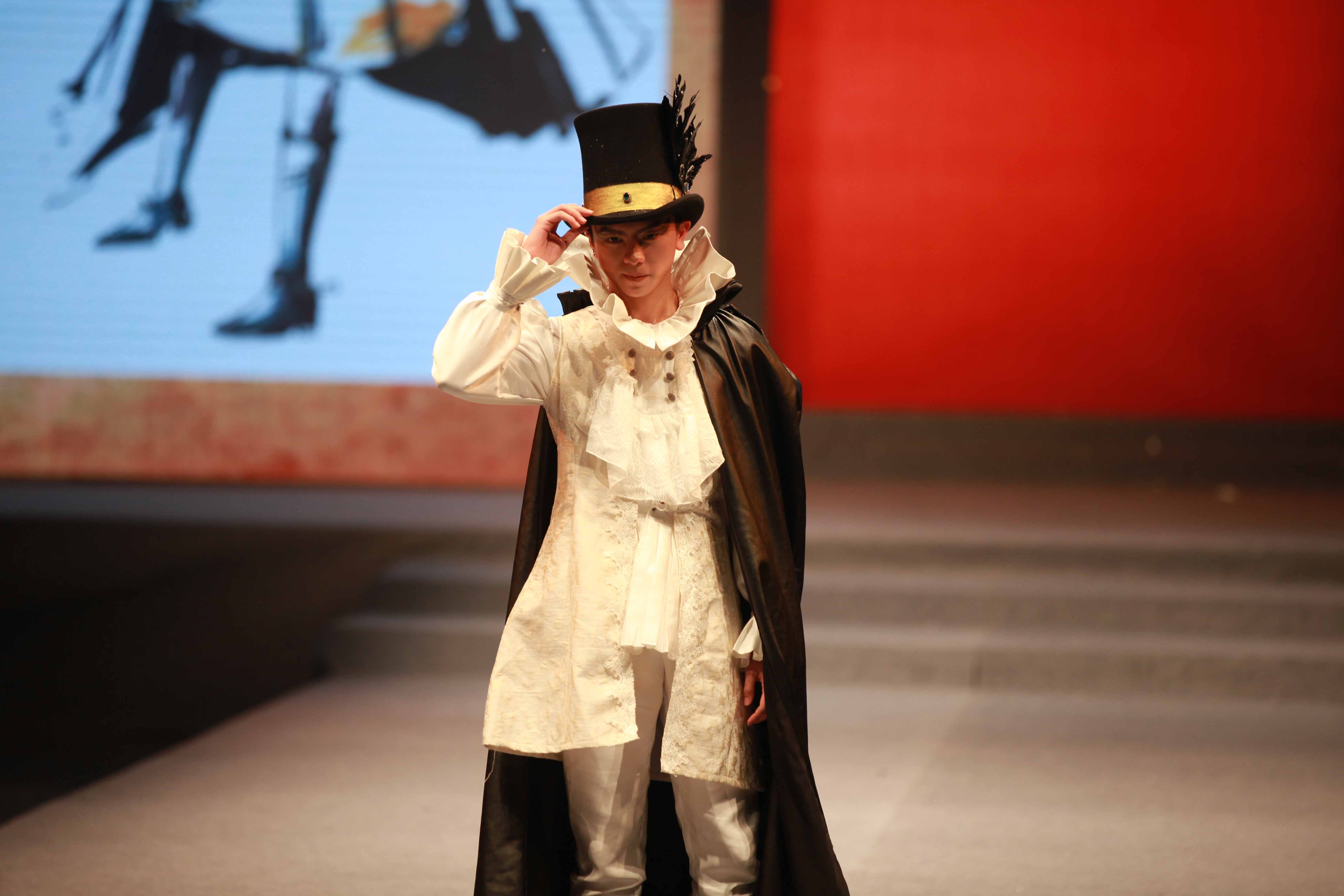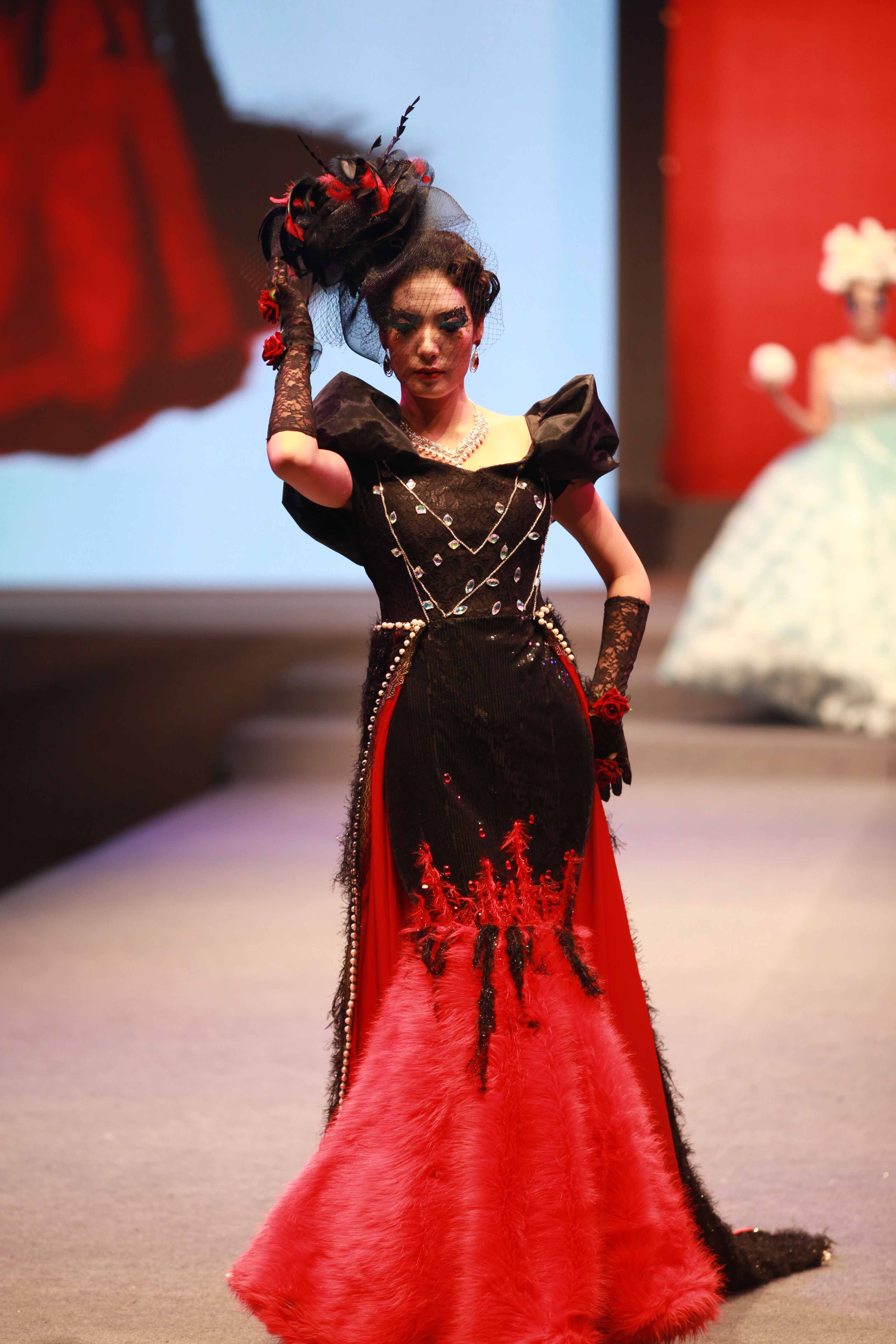 本次大赛主题为“浪漫•狂想•剧”, 大赛共分为三幕:“童话造型”、“盛装晚宴”和“复古造型”。共筛选出三十套服装参赛,作品风格多样,设计新颖,为大家呈现出了一场华丽缤纷的视觉盛宴。随着舞台上伴奏音乐的悠扬声响起,比赛正式开始。最先出场的是“童话造型”系列,以电影《灰姑娘》为创作原型,如3号设计师俞圆圆的作品以黑红为主色调设计的造型体现了继母特曼妮的冷酷。紧接着是以《公爵夫人》为题的“盛装晚宴”,简单直接的开场,仿佛带领大家走进了中世纪的欧洲,尤其是10号设计师李荣的红色礼服高贵优雅,再加上用心准备的配饰装扮,其造型上的各种细节都不由得让人为之赞叹。在充满民族风情的音乐声中,来自时尚传媒分院的何思敏老师身着民族风服装快步上台,为大家带来了一段精彩的民族舞蹈,婀娜多姿的舞姿赢得了现场观众的阵阵掌声。