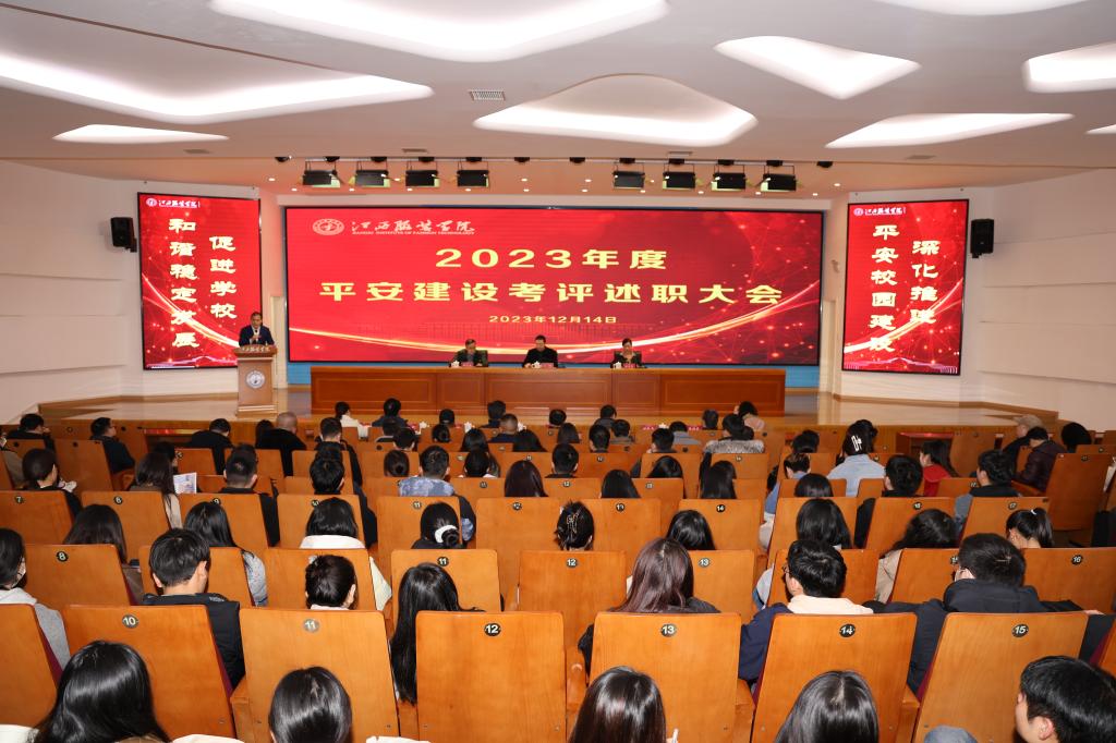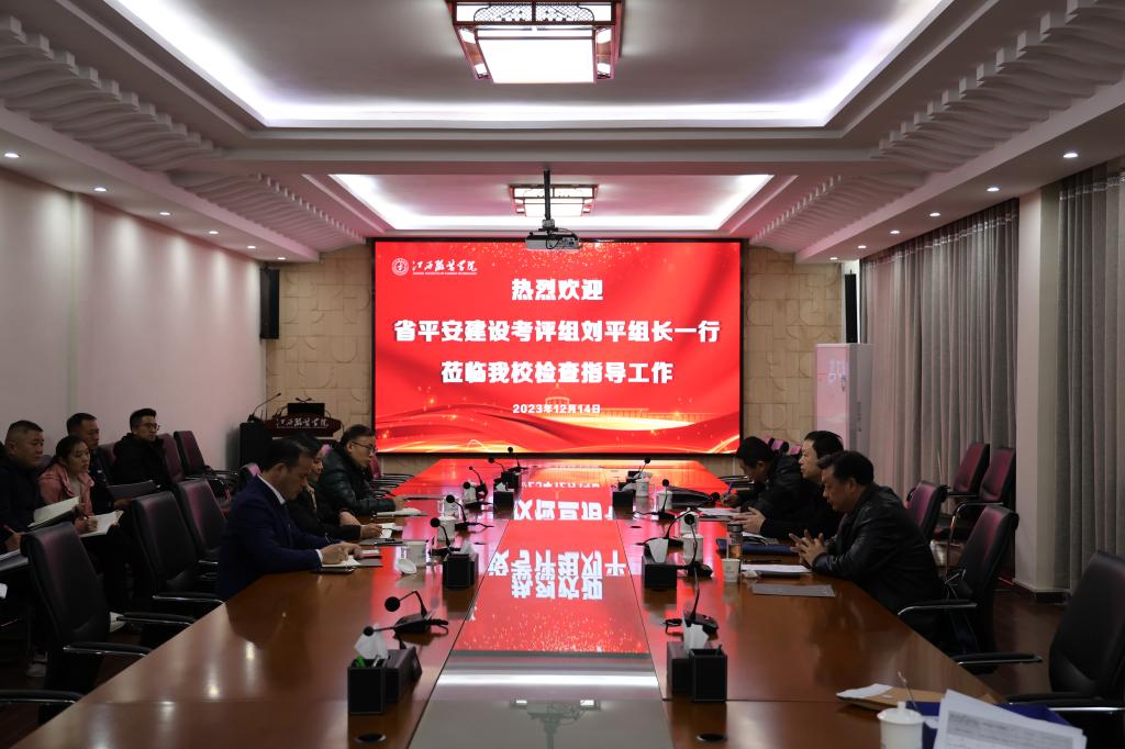 新闻中心讯(文/万强 图/万强 樊翔)12月14日上午,以省司法行政机关二级警务专员刘平为组长、省司法厅一级调研员陈国盛、中国铁路南昌局集团有限公司保卫部干部常勇为成员的省平安建设考评专家组莅临我校开展2023年度考评工作。学校在思贤楼三楼报告厅举行平安建设述职大会并现场开展满意度测评。万象城平台理事长涂燕萍、党委书记陈付龙出席会议,全体在家校领导,各部门、二级学院主要负责人及师生代表150余人参加考评会议,大会由校党委副书记唐新强主持。