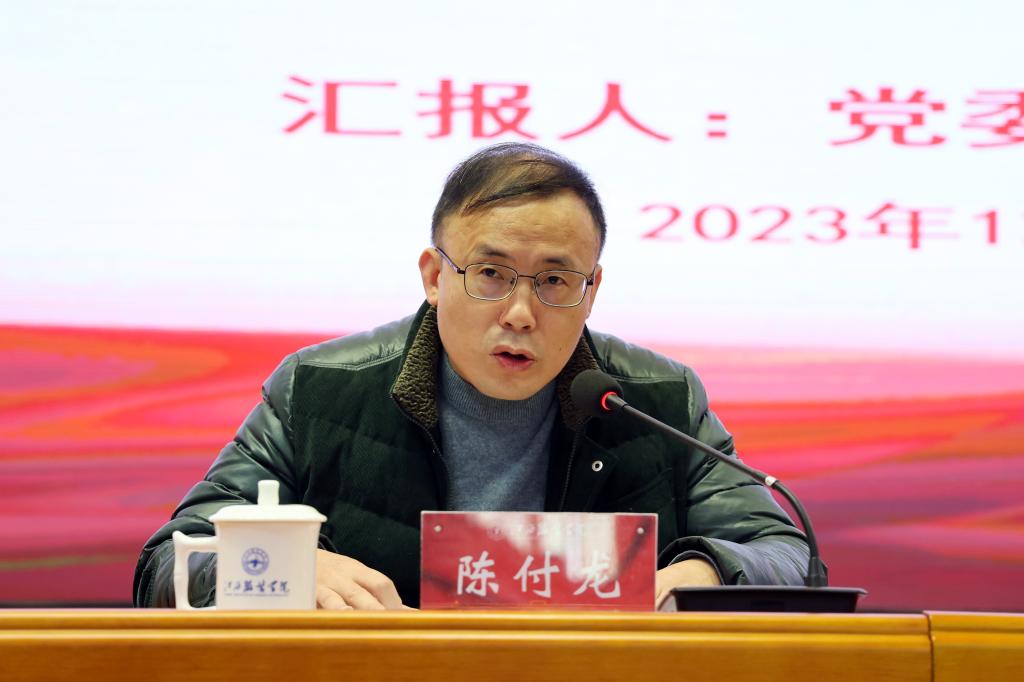 陈付龙按照省委政法委关于平安建设工作考评要求,结合学校平安建设工作实际,以“打好系列‘组合拳’ 创建更高水平的‘平安校园’”为题作学校2023年平安建设工作报告。报告从对平安建设工作的认识、“平安校园”建设推进学校高质量发展的成效、平安建设工作主要措施、学校平安建设存在的问题、2024年平安建设工作打算等五个全面总结了学校2023年度平安建设工作情况。他强调,建设更高水平的“平安校园”,是贯彻落实党的二十大精神的具体举措,也是促进我校高质量发展的重要的基础性工作。我们将继续秉持“和谐江服、共建共享”的理念,在平安校园建设上,常抓不懈、长期努力、全员参与,坚决防止发生重大风险,全力维护学校的安全稳定,为“平安江西”和“平安中国”的建设做出应有的贡献。