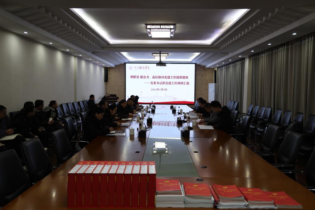 新闻中心讯(党委组织部供稿 摄影/万强)为深入贯彻落实党的二十大精神,进一步巩固扩展学习贯彻习近平新时代中国特色社会主义思想主题教育成果,认真学习贯彻习近平总书记关于党的建设的重要思想,深入贯彻落实习近平总书记考察江西重要讲话精神,全面提升基层党建工作质量。1月9日下午,省委教育工委第四调研组一行在组长彭锐的带领下莅临我校开展党委书记抓党建工作调研。校党委书记、督导专员陈付龙,党委副书记、副校长李宝君,党委副书记唐新强,校长助理闵悦等校领导,校党委委员和二级学院党组织书记参加调研汇报会和反馈会。