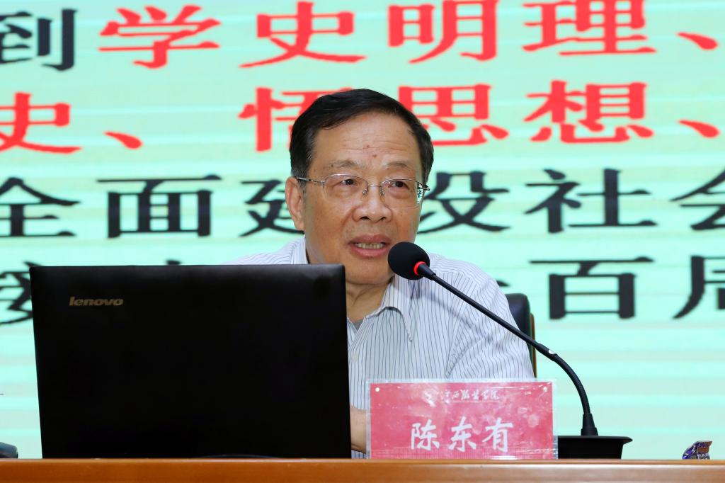 随后,陈东有教授以《不忘初心砥砺奋进的一百年》为主题,通过深入浅出、旁征博引、史论结合,对中国共产党成立及社会主义革命和建设时期、党的十一届三中全会、十三届四中全会、党的十六大、党的十八大等重大转折时期的重大事件、重要会议、重要人物等作了精辟讲解,生动诠释了中国共产党人的精神谱系,展现了一幅幅波澜壮阔、气势恢宏的历史画卷。