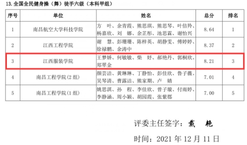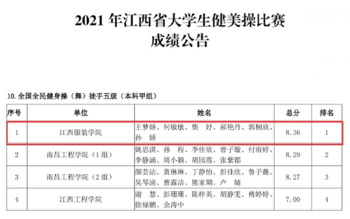 【军体部讯 赵慧撰稿】近日,由江西省教育厅和江西省体育局联合主办2021年江西省大学生健美操比赛正式落下帷幕。我校健美操代表队在主教练王甜甜老师的带领下,经过精心的备战和刻苦训练,在此次比赛中取得本科高校组第一名和第三名的优异成绩。我校健美操代表队运动健儿们以精湛的技艺,展现了江服大学生的精神风貌,为学校赢得了荣誉。