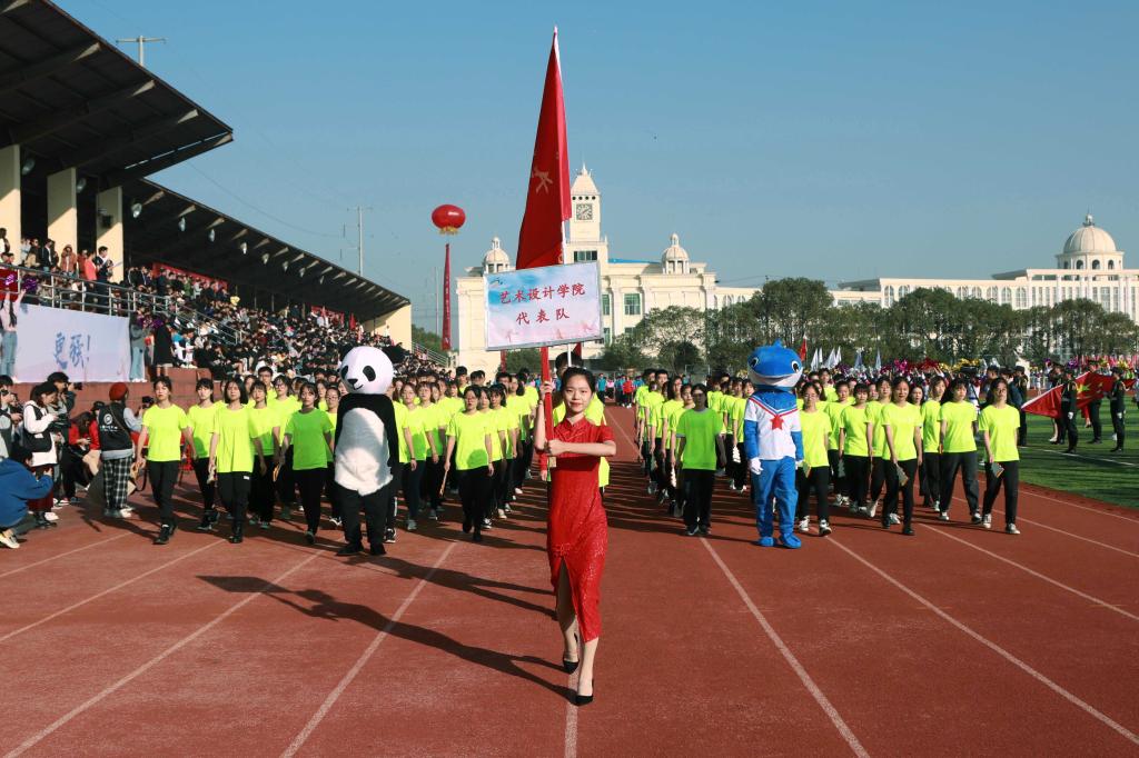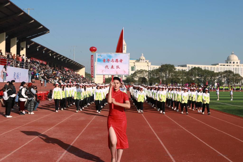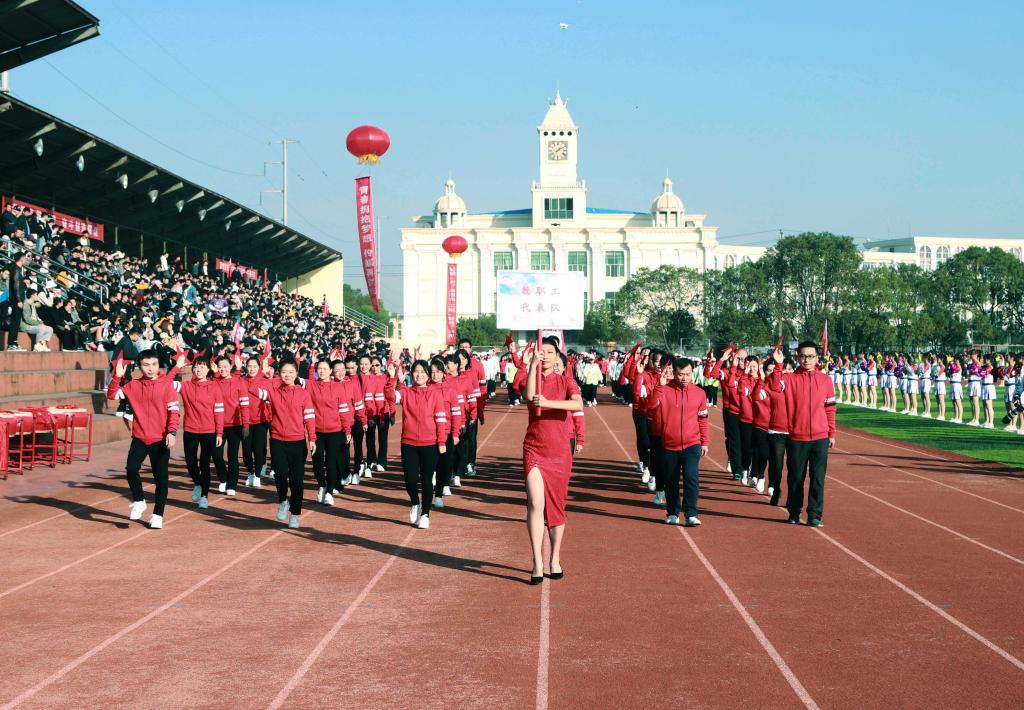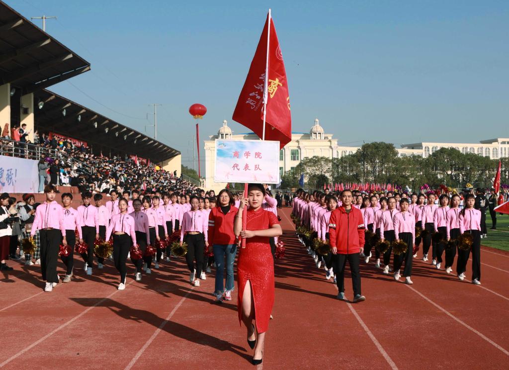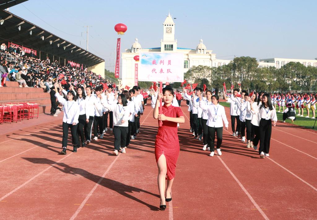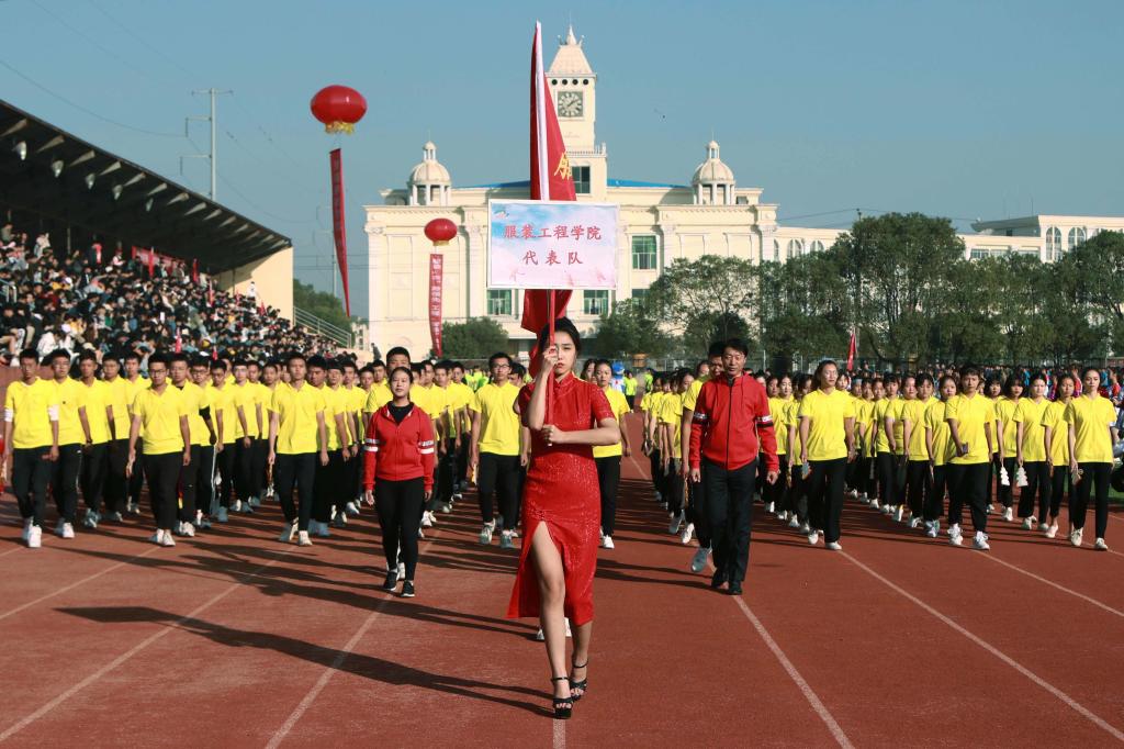 踏着青春的步伐,伴着《运动员进行曲》激昂的旋律,党旗、国旗、团旗、校旗、会徽方队,裁判员代表队,教职工代表队,志愿者代表队,各学院代表队,大学生联合会代表队和班旗方队依次入场。师生们排着整齐的队伍,迈着强劲有力的步伐,喊着响彻云霄的口号,朝气蓬勃、斗志昂扬、意气风发地依次经过主席台接受检阅。各个代表队各显特色,风采多样。他们独具创意的队型变化,展现了各学院各团体的文化特色,秀出了激情,秀出了活力,秀出了青春,他们热情洋溢的口号和自信坚定的风采展现出江服人顽强的意志和刚强的力量,获得了师生们阵阵热烈的掌声。