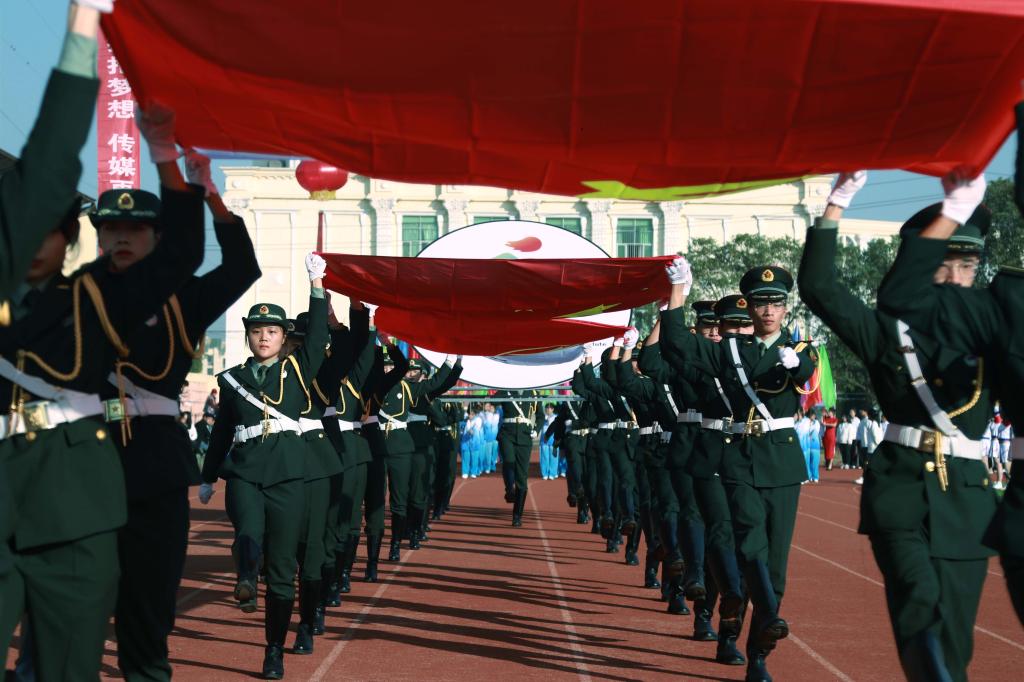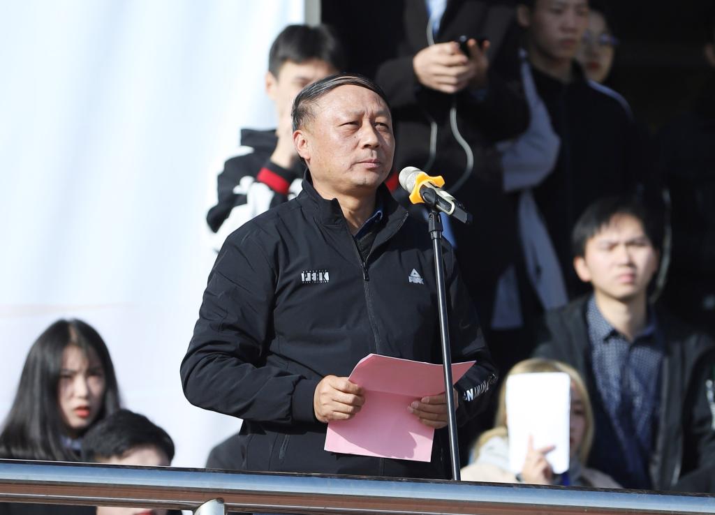 在全场师生齐声高唱庄严的《中华人民共和国国歌》后,党委副书记高建国为运动会致开幕词。他代表校党委行政向全体运动健儿们表示良好的祝愿,向辛勤筹办、组织、服务运动会的全体裁判员、工作人员、志愿者们和全体演职人员表示诚挚问候和衷心的感谢。他说,在深入学习贯彻习近平新时代中国特色社会主义思想和党的十九届四中全会精神,推进不忘初心,牢记使命主题教育活动之际,我们迎来了第17届田径运动会的开幕。他表示,多年来学校坚持落实立德树人根本任务,教育引导同学德智体美劳全面发展,重视体育教育,坚持开齐上足体育课程,体育活动蓬勃开展,各类体育赛事不断,愉悦了师生身心,健康了体魄,全校师生员工以青春阳光的朝气奋进在新时代。学校重视体育设施场地基础建设,新的室内运动场馆建设已经动工,建成后师生的体育教育、活动场所条件、环境将更加完善越、优越。他勉励全体运动员要传承体育精神,增强信心,顽强拼搏,奋勇争先,努力争取精神文明和运动成绩双丰收。希望全校师生继续深入学习贯彻习近平总书记关于体育工作重要思想和今年6月份总书记给北体大2016级研究生冠军班全体学生的回信精神,不忘初心,牢记使命,树立健康第一的教育理念,把弘扬体育精神与培育践行社会主义核心价值观紧密结合,积极推进体育教育改革,助推体育运动成为师生的生活方式,享受体育运动的乐趣,享受健康带给我们的幸福美好生活, 为实现中华民族伟大复兴中国梦持续奋斗。