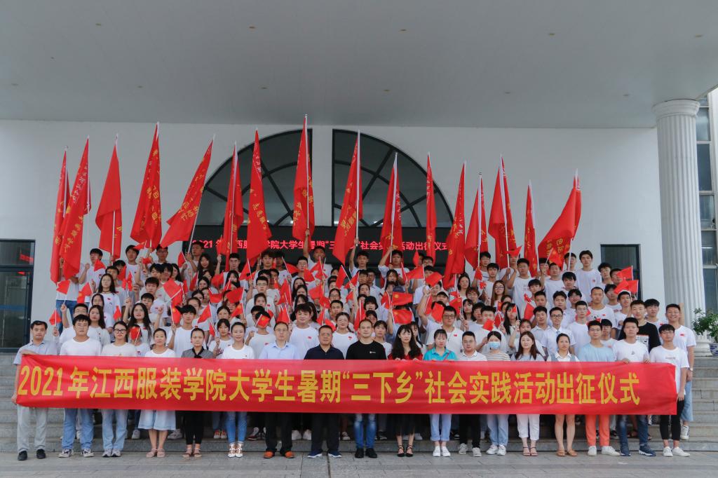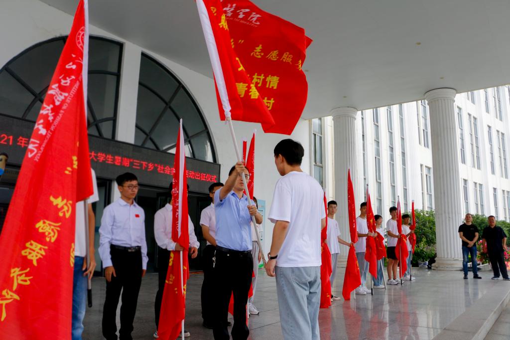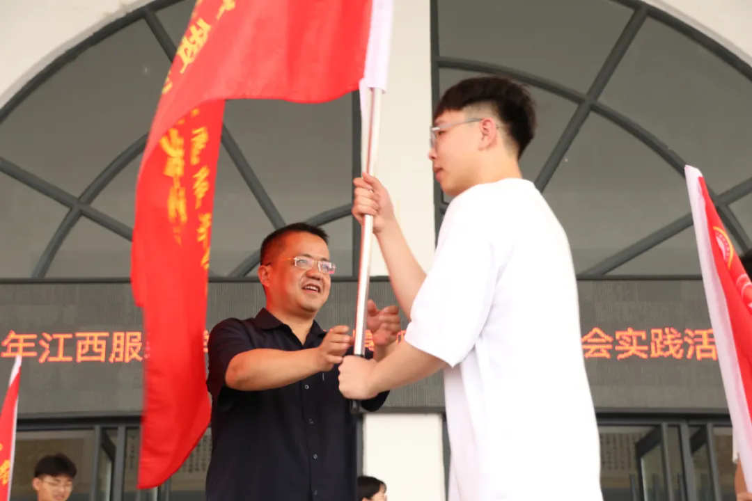 出征仪式在全体人员奏唱《中华人民共和国国歌》中拉开帷幕。校理事长涂顺强、校党委书记陈付龙分别向暑期“三下乡”11支队伍、“文明志愿行”5支队伍授旗。领导老师们将队旗递交至各团队队长的手中,他们传递的不仅是一面旗帜,而是对队伍的殷切鼓励与大力支持,更是对江服青年积极投身于社会实践的充分肯定。