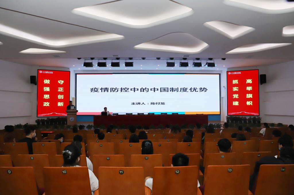 陈付龙带领大家回顾了在以习近平同志为核心的党中央领导下,全国上下众志成城、共克时艰的抗疫历程。从“坚持党的集中统一领导的制度优势;坚持以人民为中心的制度优势;坚持集中力量办大事的制度优势;新冠肺炎疫情带来的思考与启迪”四个方面对疫情防控中的中国制度优势进行全面的分析和解读,进一步引领同学们认识中国特色社会主义制度的优势,让大家深刻感受到“中国制度”在疫情防控中的巨大作用。陈付龙指出,在这场世界级的大考中,中国共产党和中国人民交上了一份令世人称赞的答卷,也为世界各国提供了应对重大公共卫生突发事件的中国方案,充分体现了中国国家治理体系和治理能力的显著优势。这一显著优势集中体现在中国共产党的坚强领导力、政府的高效组织力、广大人民的强大行动力。陈付龙紧密结合疫情防控的生动实践,与师生交流了在疫情大考中淬炼中国之治、在中国之治中彰显制度优势、在制度自信中实现民族复兴,并提出新冠疫情带来的启迪:为什么中国在疫情防控中会交出如此漂亮的答卷呢?