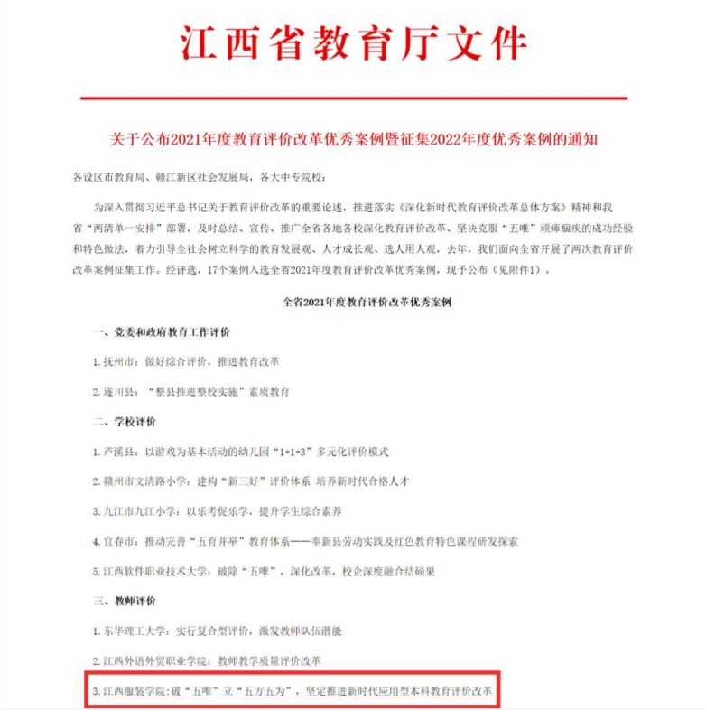 新闻中心讯(质评中心供稿)5月17日,江西省教育厅办公室发出《关于公布2021年度教育评价改革优秀案例暨征集2022年度优秀案例的通知》,公布了全省17个教育评价改革优秀案例,其中我校《破“五唯”立“五方五为”,坚定推进新时代应用型本科教育评价改革》案例成功入选。