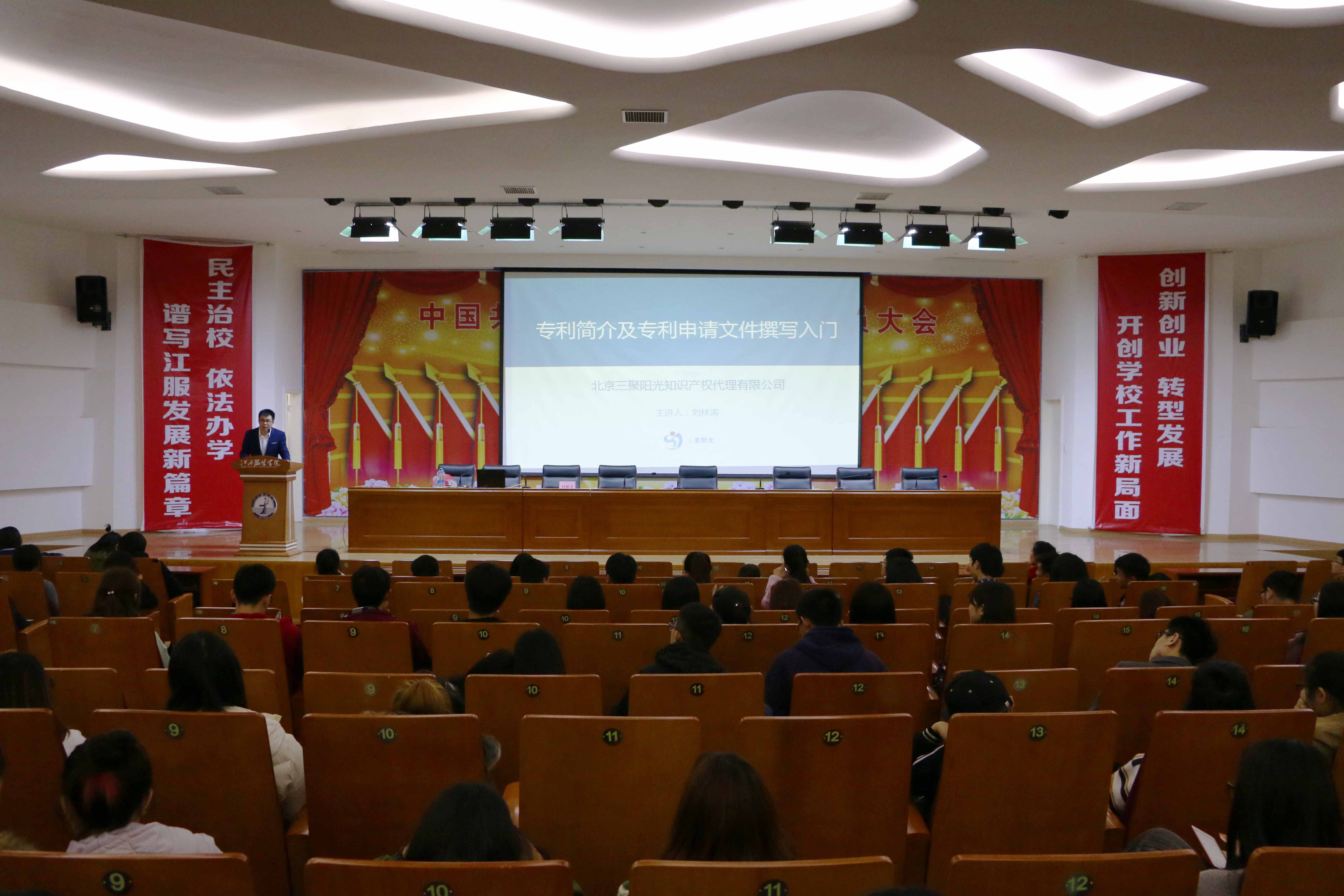 2017年3月9日晚,我校在思贤楼三楼报告厅组织召开了学生专利培训会。本次培训由北京三聚阳光知识权代理有限公司专利代理人刘林涛先生担任主讲。科研处、各分院师生代表共400多人参加了本次活动。