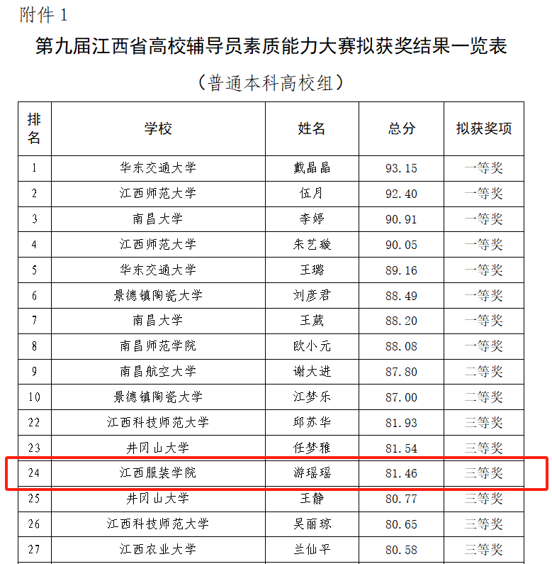 新闻中心讯(学工处供稿) 近日,由中共江西省委教育工委、江西省教育厅主办的第九届江西省高校辅导员素质能力大赛在南昌举行。经基础知识测试、案例研讨、谈心谈话三个环节的激烈比拼,我校辅导员游瑶瑶老师荣获大赛三等奖。
