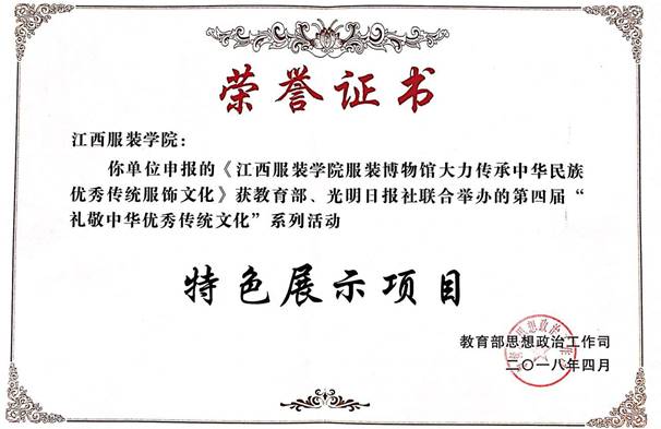 我校中华服饰博物馆已先后荣获由省委宣传部和省社会科学界联合会评选授予的“江西省优秀社科普及宣传基地”,被评为“全国社会科学普及教育基地”、教育部“中华优秀传统文化特色展示项目”(江西唯一)等。省文化厅已批准建立“中华服饰文化中心”。