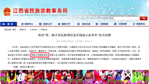 服装报讯 2019年1月28日,江西省民宗局发布公示,我校与贵溪市樟坪畲族乡太源畲族村等11家单位确定为第二批“全省民族团结进步创建示范单位”,并以省民族工作领导小组的名义命名挂牌。