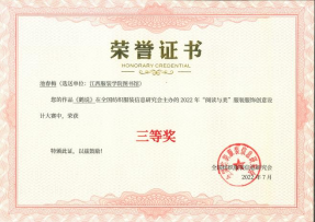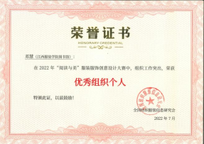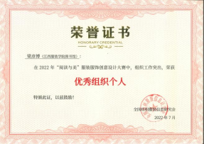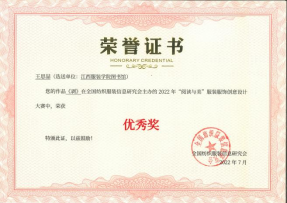 新闻中心讯(图书馆梁彦博供稿) 由全国纺织服装信息研究会主办的2022年“阅读与美”服装服饰创意设计大赛历时4个多月,圆满落幕。我校图书馆组织的110多名学生参加了本次大赛。其中19服工本科3班池春梅同学的作品《鹤说》获三等奖,19服智本科1班王思喆同学的作品《剥》获优秀奖,图书馆获优秀组织单位奖,邓慧、梁彦博两位老师获优秀组织奖个人奖。