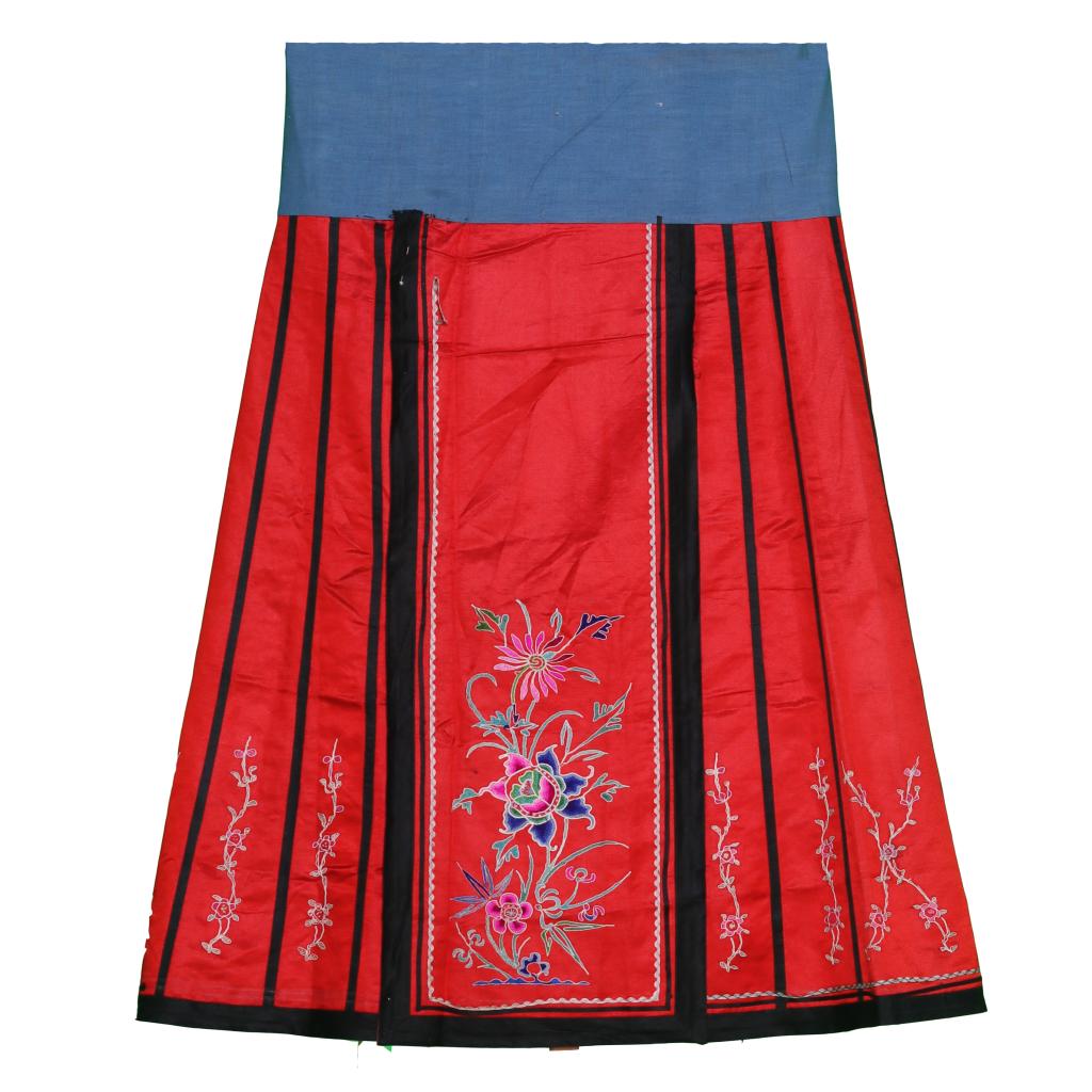 清晚期 | 红绸五彩三蓝绣花卉纹阑干裙