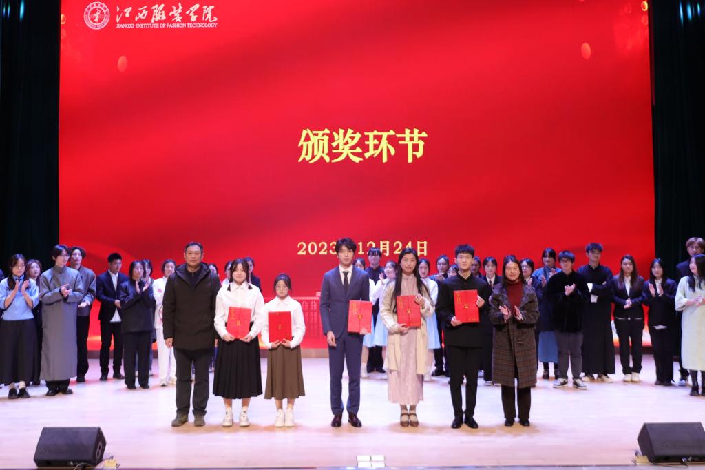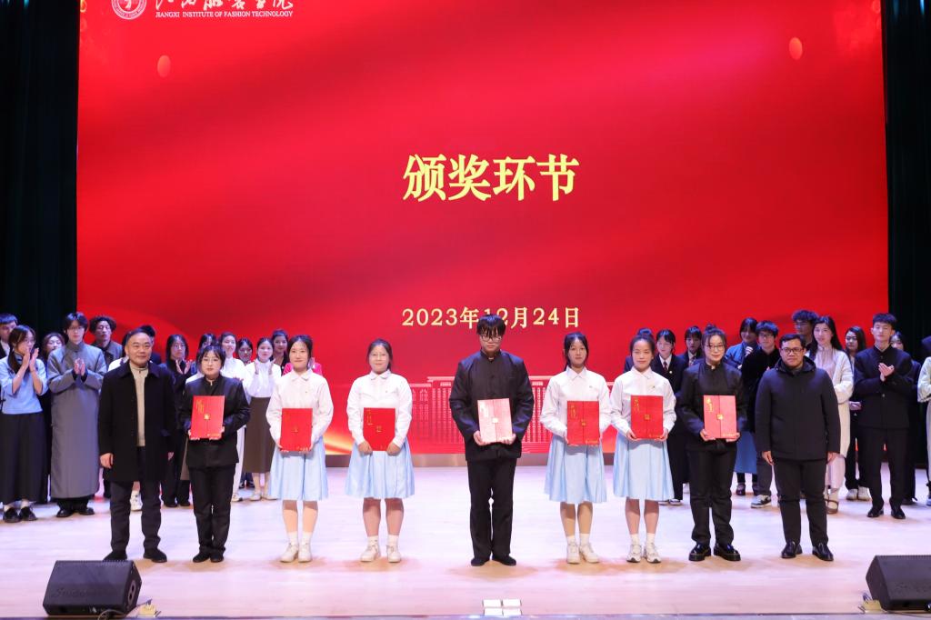 服装设计学院党委书记蓝岚、服装工程学院党委书记彭波为三等奖获得者颁奖