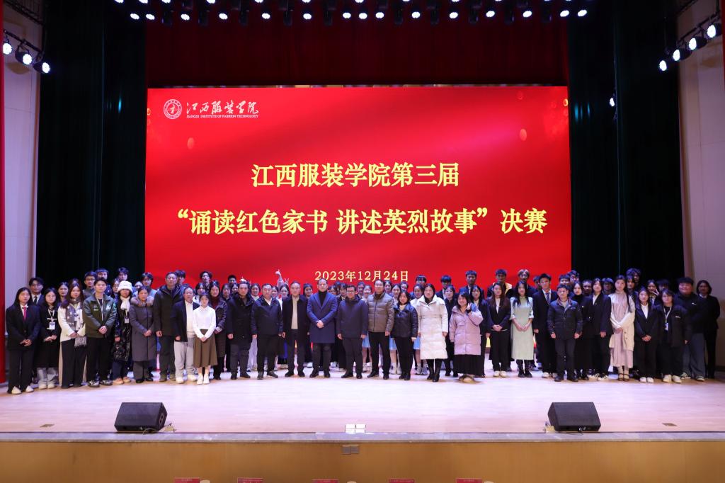新闻中心讯(记者/谭婧炜 实习记者/张恩智 刘北辰 摄影/服装报社摄影部) 一封封红色家书,召唤着尘封的记忆;一个个英烈故事,引领着奋进的方向。为深入学习贯彻党的二十大精神,教育引导江服青年大学生从红色家书中重温革命历史,传承红色基因,从英烈故事中汲取奋进力量,赓续红色血脉,激励同学们立志做有理想、敢担当、能吃苦、肯奋斗的新时代好青年。12月24日下午,我校在体育馆表演厅举行了第三届“诵读红色家书,讲述英烈故事”大赛活动。校党委副书记唐新强出席活动。江西警察学院马克思主义学院院长廖宝光教授、南昌师范学院马克思主义学院院长向绪伟教授担任活动评委。校党委委员、宣传部部长沈新建,学工处处长邓良峰,以及各学院党委(党总支)书记观摩了演出,在场的还有各学院学工办主任、辅导员以及学生党员和入党积极分子代表等共计400人。本次大赛还通过视频号进行了现场直播,有4000余人线上观看了演出,取得了良好的宣传教育效果。