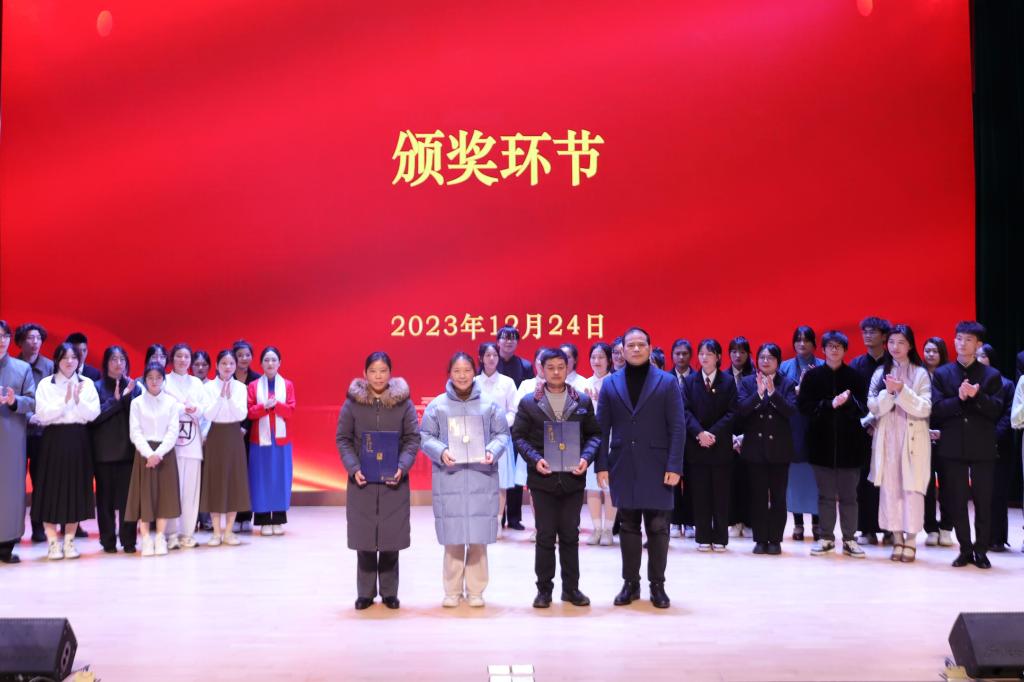 艺术设计学院党委书记冯琼芳、商学院党委书记黄晶磊、大数据学院党总支书记王春梅为优秀奖获得者颁奖