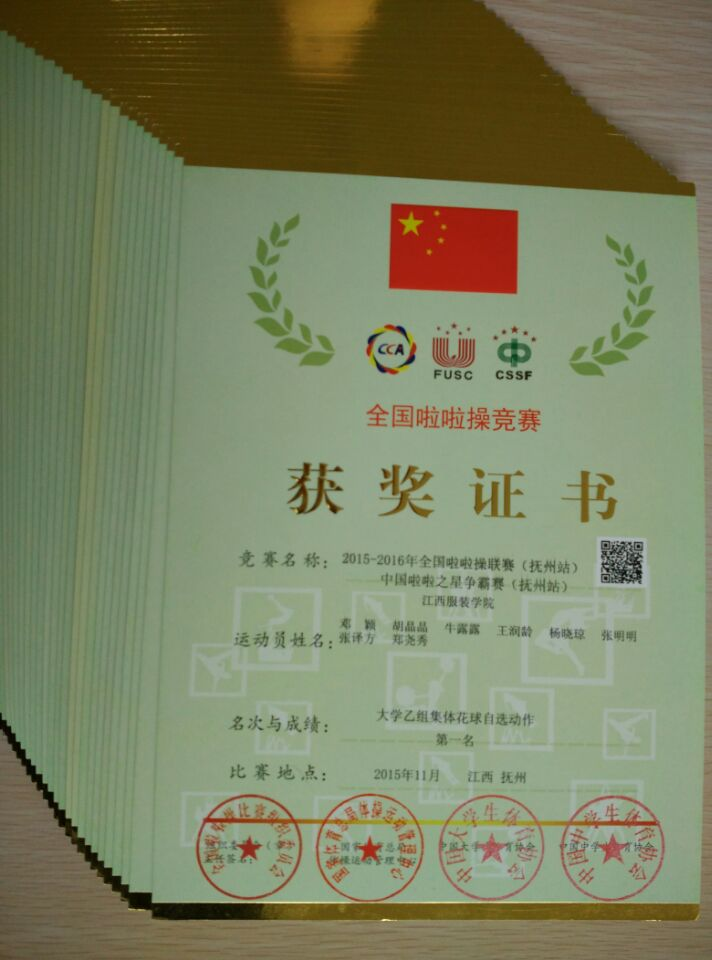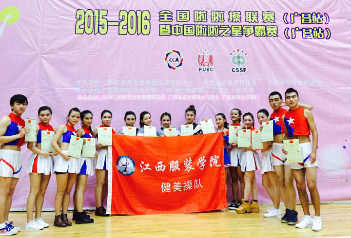 服装报讯 2015-2016年全国啦啦操联赛暨中国啦啦之星争霸赛(广昌站)于11月13日至15日在江西广昌县体育中心举行,我校健美操代表队喜获大学乙组集体花球自选动作第一名和规定动作第三名的好成绩。