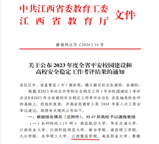 新闻中心讯(江宣)近日,江西省教育工委、教育厅公布了2023年度全省平安校园建设和高校安全稳定工作考评结果,我校连续三年获得省委教育工委、省教育厅通报表扬。