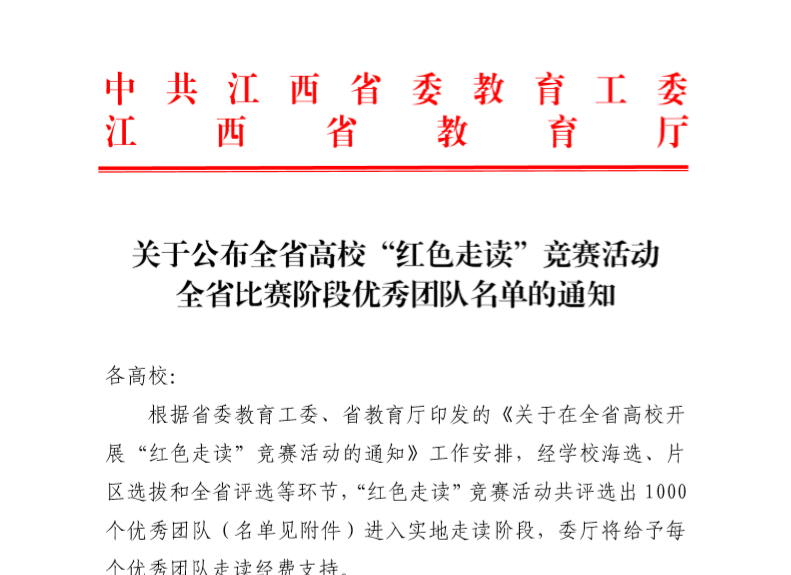 新闻中心讯:近日,江西省委教育工委、省教育厅公布了全省高校“红色走读”竞赛活动全省比赛阶段优秀团队名单。经学校选拔、片区海选、全省评选,我校七支队伍入选全省优秀团队,成绩喜人。