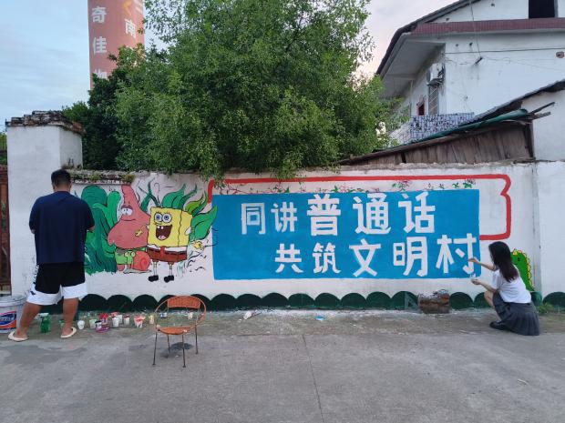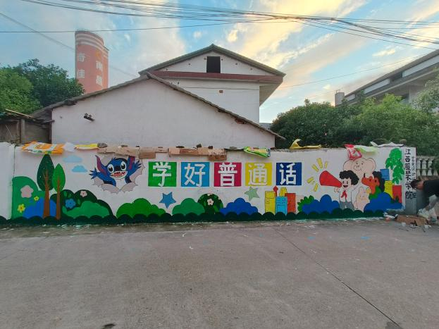 经过实践队员两天的努力,这面墙壁已经焕然一新。这一活动不仅仅体现了江服青年用艺术展现乡村美丽,推进乡村文化振兴,也宣扬推广了学好普通话的重要性。乡村建设是一条任重而道远的任务,江服青年们要紧跟党的步伐,扎实奋斗在乡村一线,发挥自己的专业特长,用艺术唤醒乡村活力,用美学讲好中国乡村故事,用青春推进美丽乡村建设。