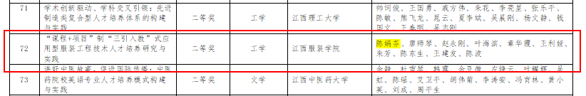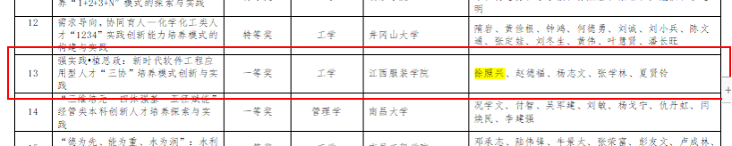 新闻中心讯(教务处 陈妍撰稿) 2023年10月26日,江西省教育厅公示了2022年江西省教学成果奖拟获奖项目名单,我校教师徐照兴教授主持的《强实践•植思政:新时代软件工程应用型人才“三协”培养模式创新与实践》,以及陈娟芬教授主持的《“课程+项目”制“三引入教”式应用型服装工程技术人才培养研究与实践》教学成果分别拟获高等教育类一等奖和二等奖。此次获奖充分体现了学校在人才培养、教育教学改革等方面取得了显著成效。