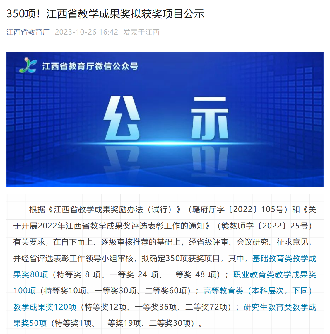 江西省教学成果奖由省人民政府设立,由省教育行政部门组织实施,每四年评审一次,代表着我省教育教学改革理论创新与实践探索的重要成果,分设基础教育、职业教育(含技工教育)、高等教育(本科层次)、研究生教育四大类,设特等奖、一等奖、二等奖3个等次,共350项,其中高等教育类120项,一等奖授予比例30%左右,二等奖授予比例60%左右。
