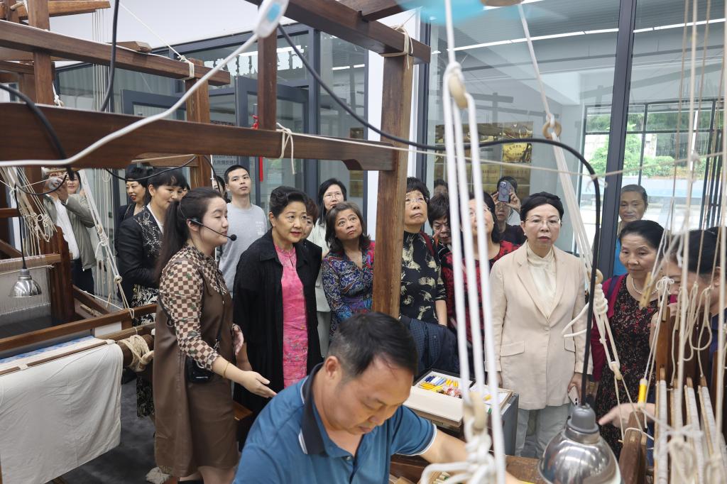 洪崖清露音乐沙龙一行实地考察了我校名师工作室、纺织服装现代产业学院、服饰文化博物馆、古丝绸织绣技艺研究院、服装工程技术产业学院等地。对学校的服饰文焕内涵和在保护和传承非遗文化中所作的努力和取得的成绩给与高度肯定。