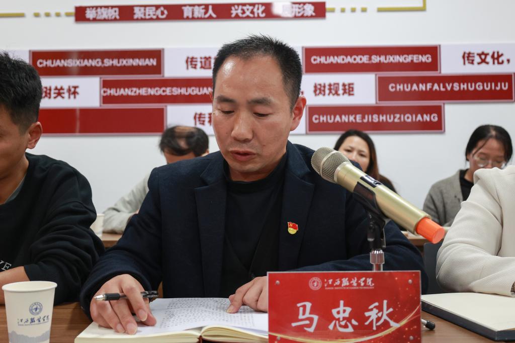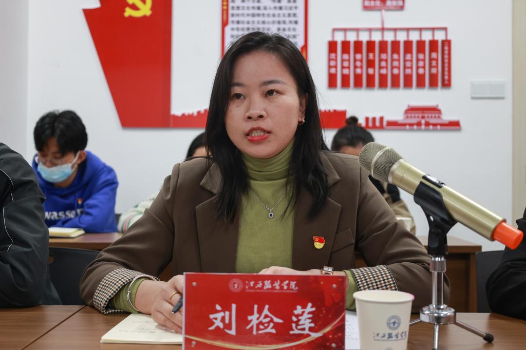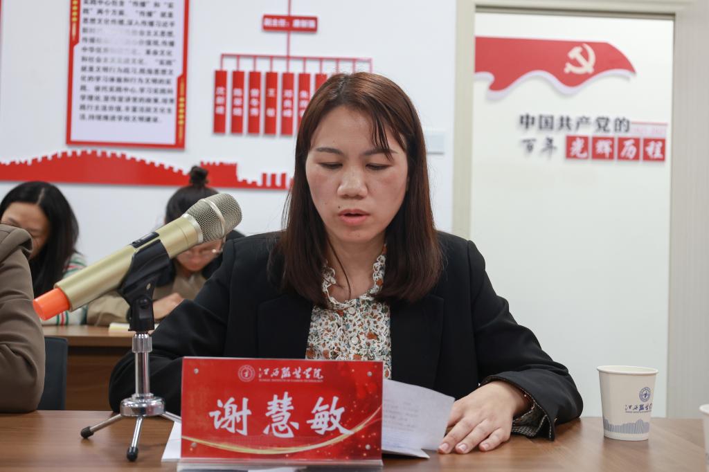 会上,马克思主义学院院长肖杰、校团委书记孟安然、人文学院党总支副书记马忠秋、全国民办高校优秀辅导员、学工处思政科副科长刘检莲、民盟万象城平台支部主任委员虞谦、党外知识分子代表、江西省“三八红旗手”“十佳军嫂”谢慧敏、2022年度学校服务标兵、组织部干事毛益剑、江服大学生宣讲团成员都雨涵围绕学习宣传贯彻党的二十大精神,结合工作实际,作了交流发言。
