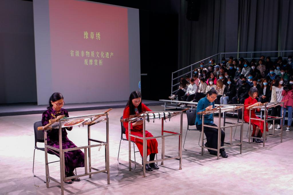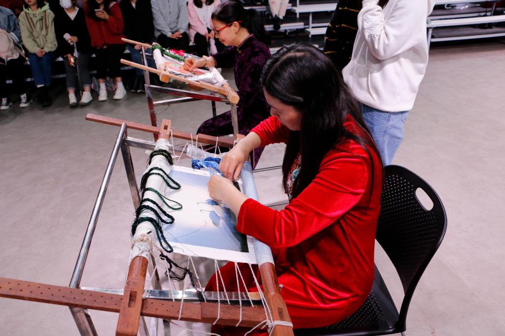 在活动现场,余正连、周南英两位老师演示了赣绣的传统工艺,并向同学们介绍了赣绣的相关知识,解答了同学们提出的问题,让同学们感受中国传统文化的深刻内涵。一些同学更是在大师的指点下穿针引线一回,和传统民间艺术亲密接触、亲身体验。