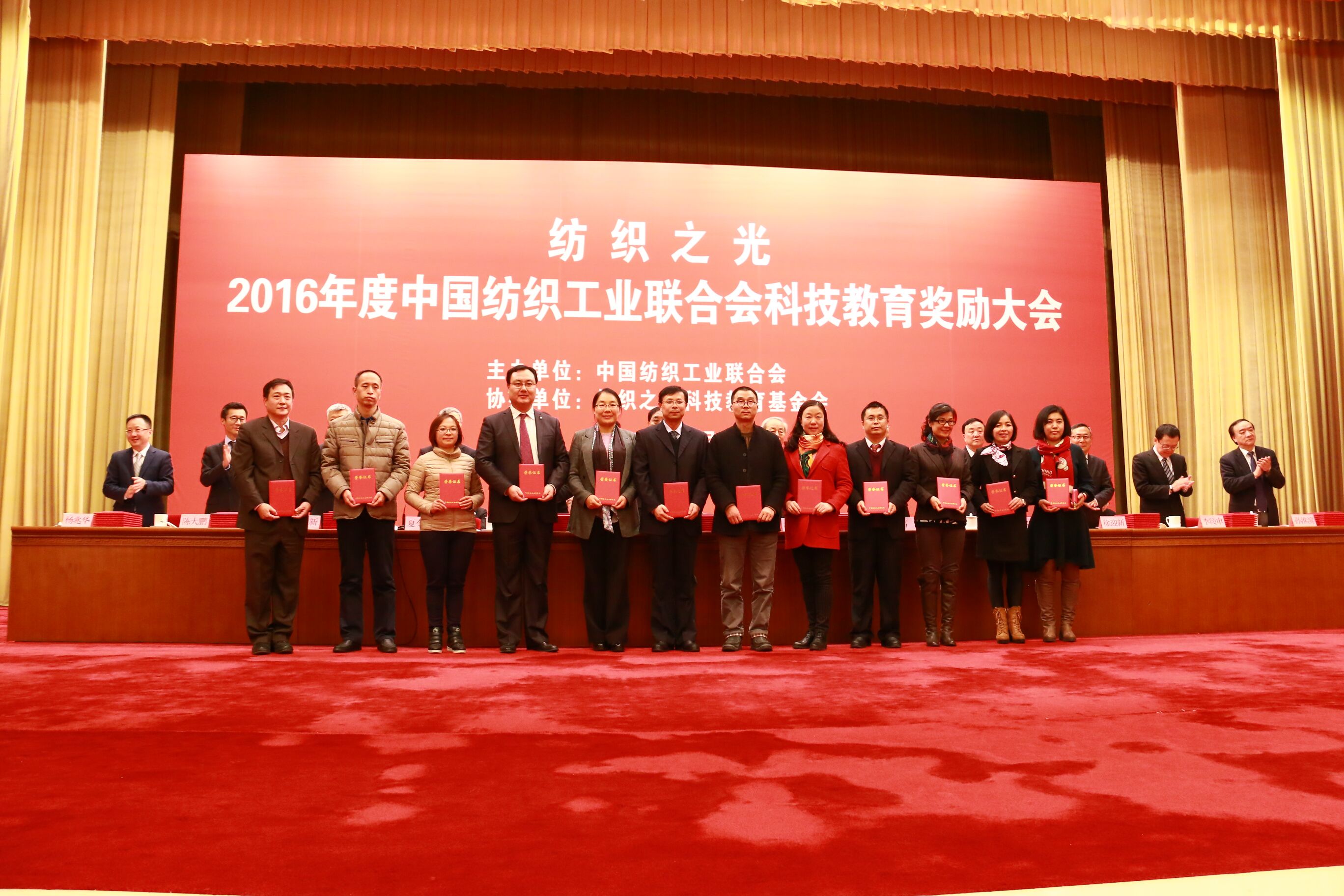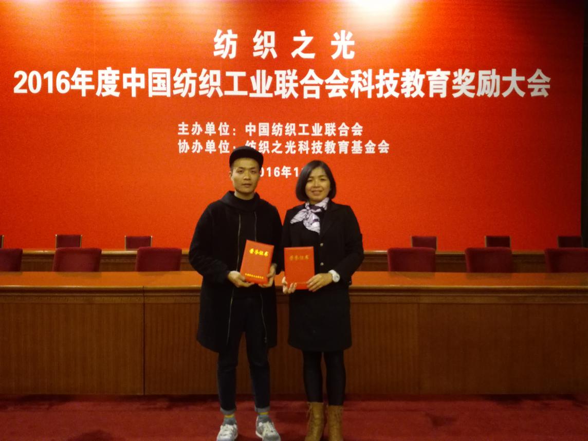 服装报讯:11月23日,“纺织之光”2016年度中国纺织工业联合会科技教育奖励大会在人民大会堂举行,中国纺织工业联合会及各专业协会领导、中国纺织工业联合会奖励委员会委员出席会议,为获得2016年度科学技术奖、教育教学成果奖、教师奖、学生奖、针织内衣创新贡献奖的获得单位和个人代表颁奖。我校教务处处长朱秋月和学生代表秦泰参会。