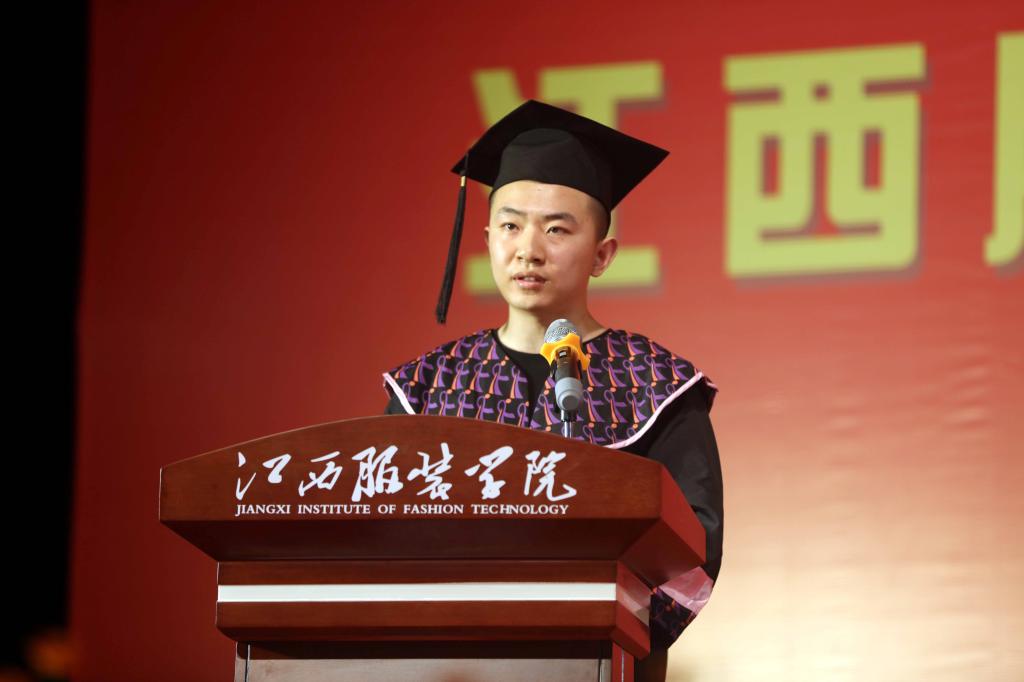 服装工程学院14级服设本科3班张龙同学作为本科毕业生代表上台发言。从初到学校的懵懂到获得中国时装设计新人奖第一名,张龙分享了在江服的这四年,见证了江服日新月异的变化过程。临行之际,张龙感谢了谆谆教诲他的辅导员和老师们,让他更有信心和勇气走向未来的路,他也祝愿母校顺利通过本科教学合格评估,学术百花齐放,育人桃李芬芳。