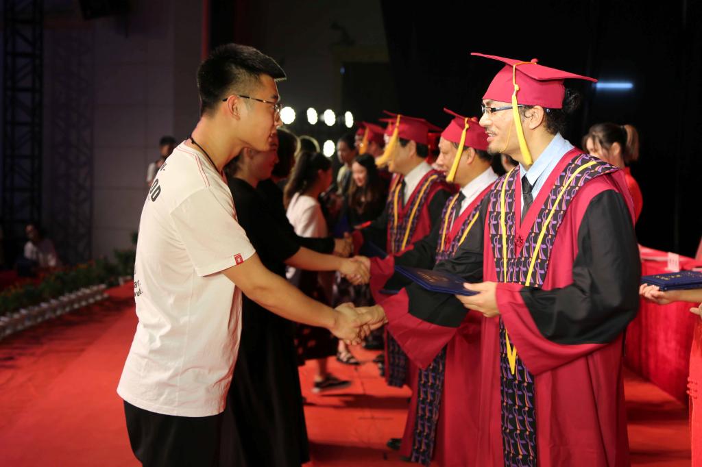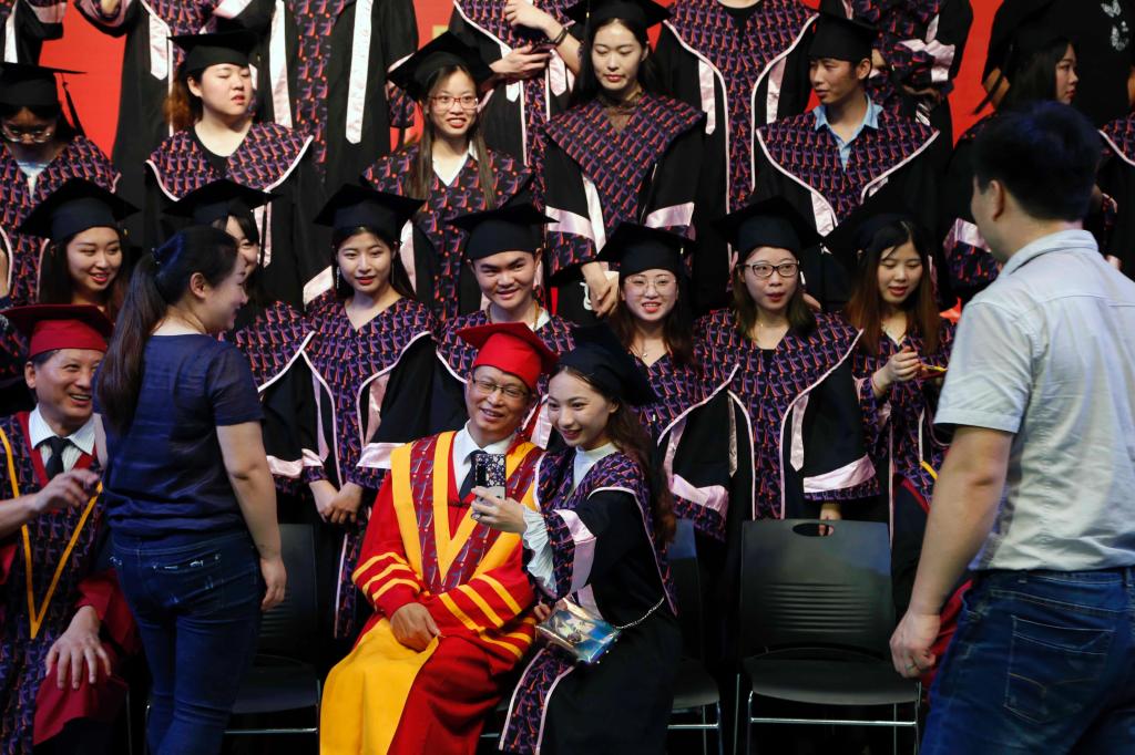 在学位授礼合影中,有些毕业生还主动与校长握手、拥抱校领导、献上鲜花,引起现场阵阵欢呼。