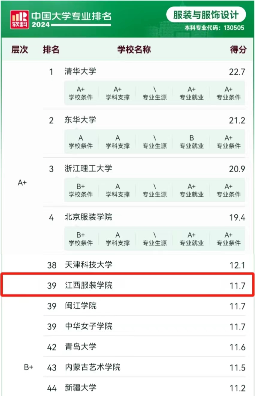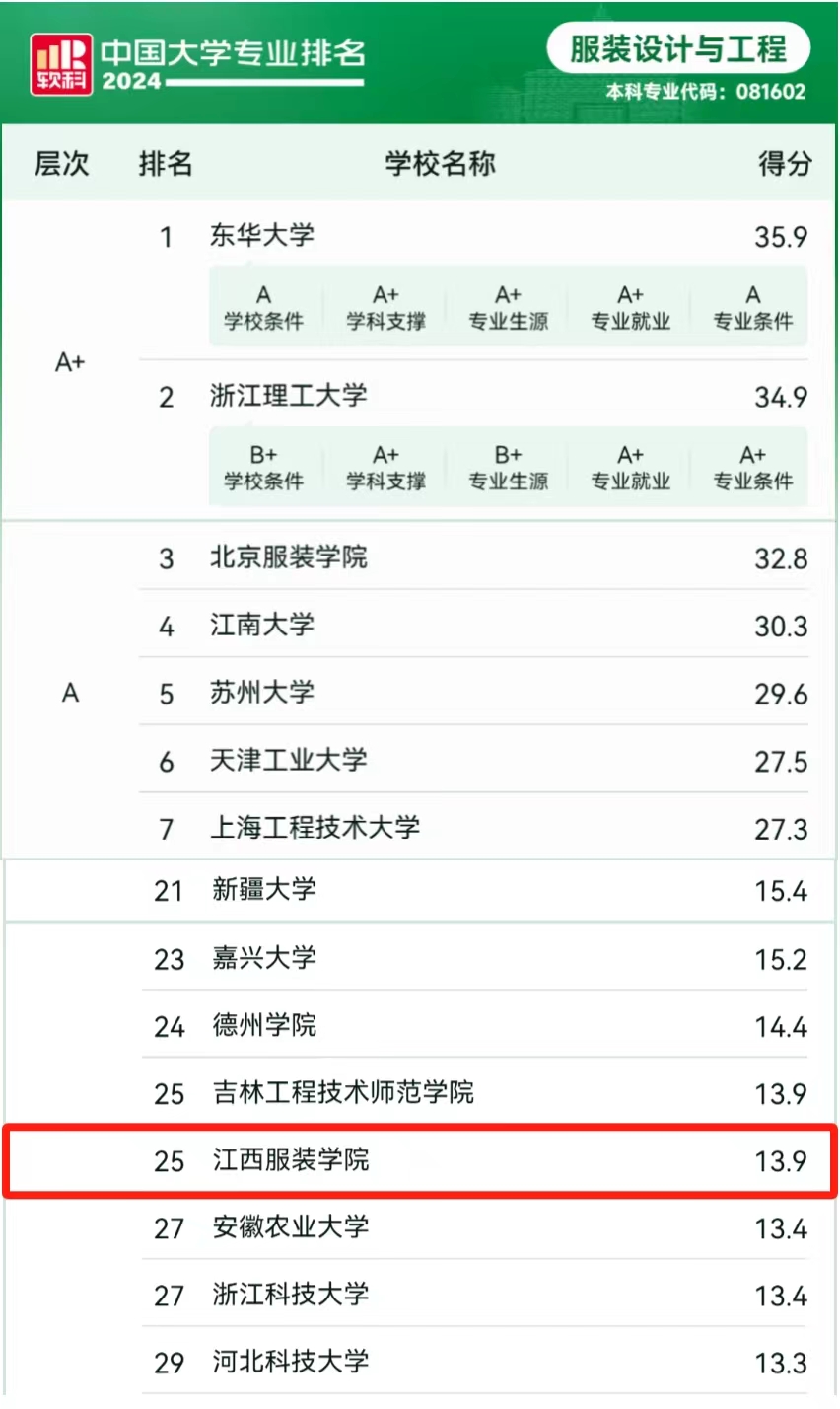 新闻中心讯 近日,高等教育专业评价机构软科发布“2024软科中国大学专业排名”,万象城平台服装与服饰设计专业在全国排名第39位、环境设计专业在全国排名第174位,均居B+层次,服装设计与工程专业在全国排名第25位。