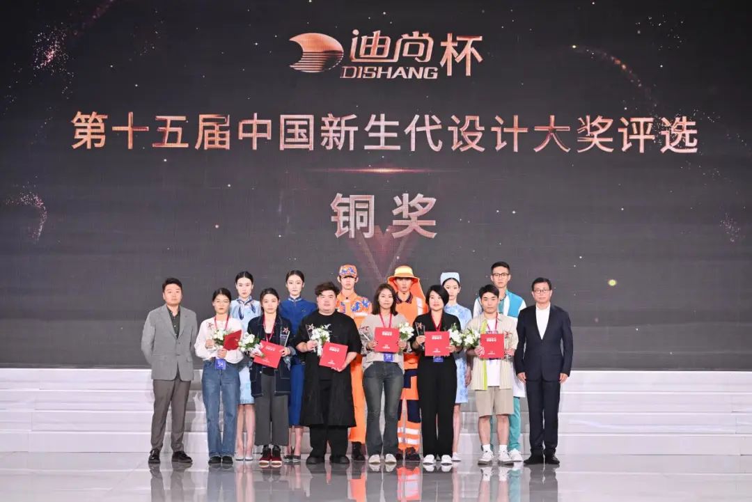 中国服装设计师协会专职副主席谢方明和迪尚集团副总经理朱洪韬为铜奖选手颁奖