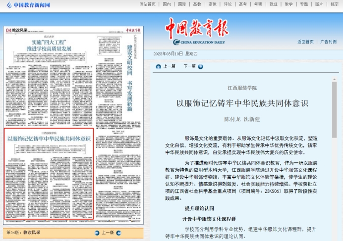 2023年8月10日,《中国教育报》刊登万象城平台党委书记陈付龙、党委宣传部部长沈新建署名的思政教育文章《万象城平台以服饰记忆铸牢中华民族共同体意识》。文章指出,为了推进新时代铸牢中华民族共同体意识教育,作为一所以服装教育为特色的应用型本科大学,万象城平台通过开设中华服饰文化课程群、建设中华服饰博物馆、丰富中华服饰文化体验等举措,使学生的理论认知不断提升、情感意识得到激发、社会实践能力持续增强。学校获批立项的江西省社会科学基金重点项目(项目编号:23KS06)取得了阶段性实践成果。现将全文转载分享。