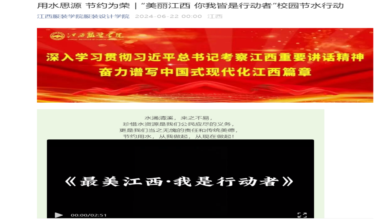 为了使同学们更好地通过宣传了解低碳环保,节约资源。学校组织了“美丽江西·我是行动者”主题宣传片拍摄,并认真组织学生们观看宣传片。通过视频宣传达到更深入地了解和认识环境保护的重要性,环保意识进一步地提高。同时对江西的自然风光和生态环境有了更加深刻地认识和感受,对家乡的热爱之情也愈发浓厚。