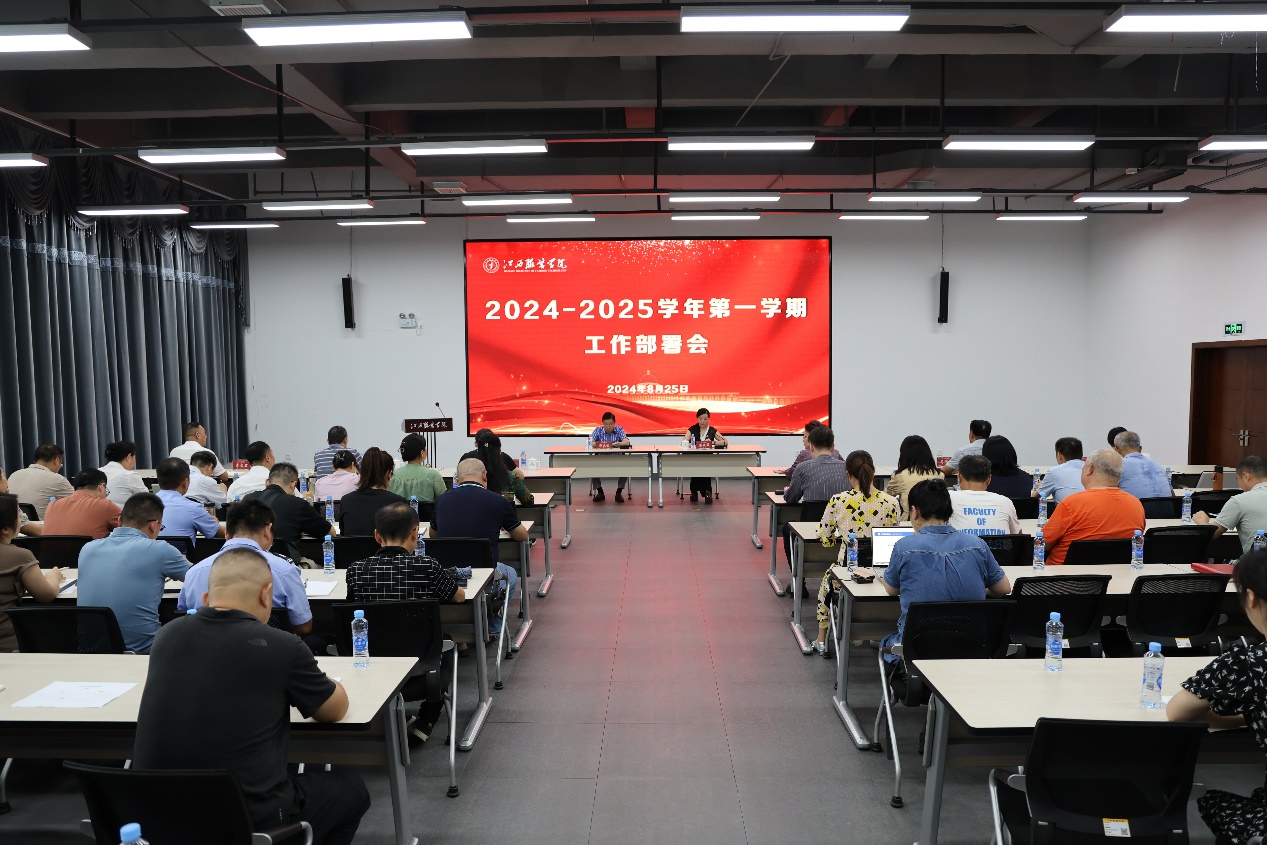 新闻中心讯(图/文 万强)为进一步统一思想认识,围绕学校发展目标和本科教学审核评估强信心、鼓士气、理思路、明重点、攻难点、找差距、促发展,8月25日下午,我校召开2024—2025学年第一学期工作部署会。校理事长涂燕萍、校长薛家宝、党委副书记唐新强,副校长贾丽霞、校长助理李沛武、马国照、尹娜娜出席会议。全校中层干部参加会议,全体行政人员、各学院教研室主任、辅导员、副高职称以上人员在分会场线上聆听了会议。会议由党委副书记、副校长李宝君主持。