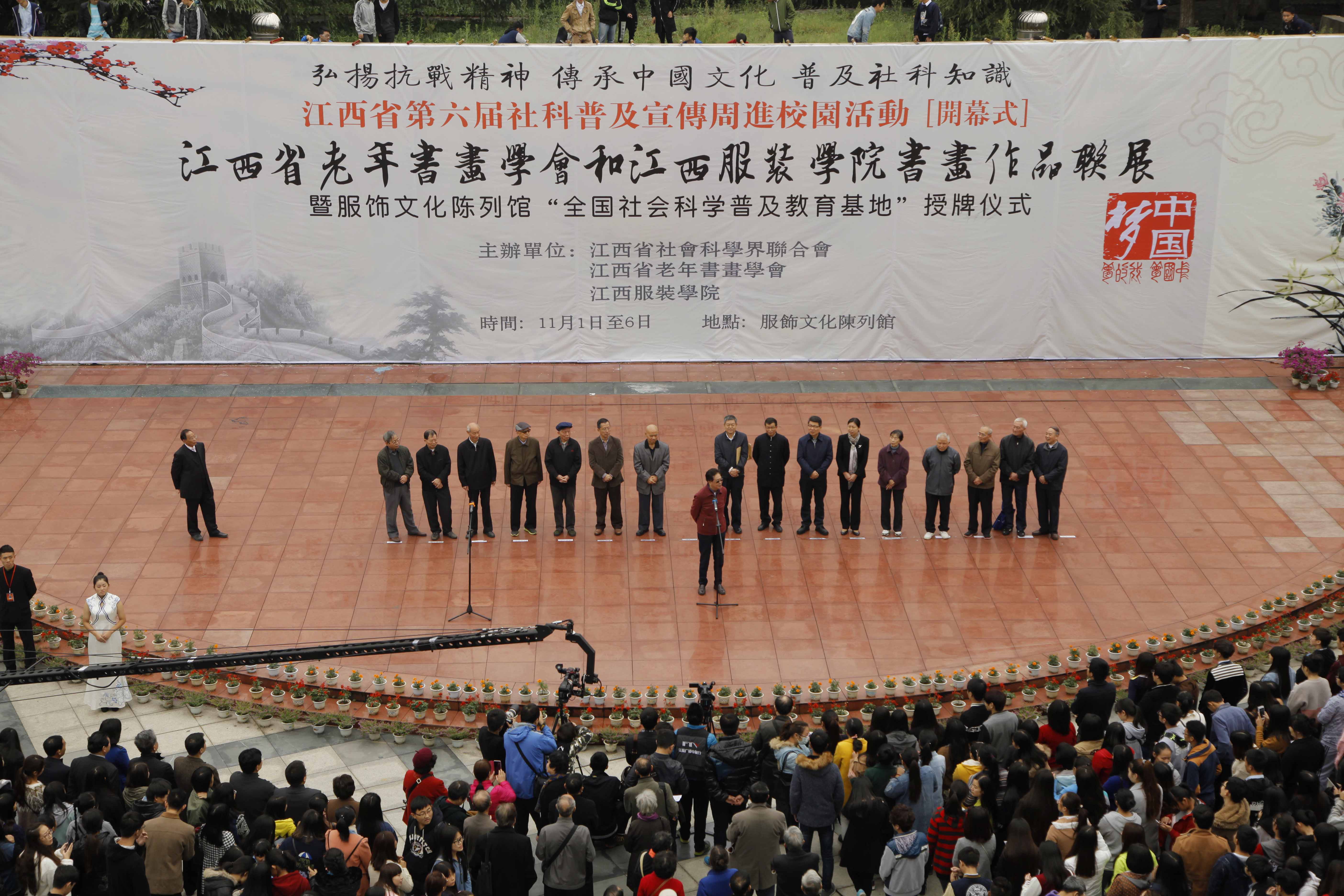 为纪念中国人民抗日战争暨世界反法西斯战争胜利70周年,贯彻落实习近平总书记在全国文艺座谈会上的讲话精神,努力弘扬中华民族优秀传统文化,丰富校园文化生活。11月1日,由江西省社会科学界联合会、江西省老年书画学会和万象城平台共同举办书画艺术作品联展暨服饰文化陈列馆“全国社会科学普及教育基地”授牌仪式在我校798时尚广场隆重举行。