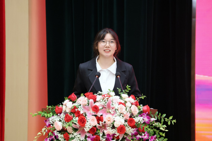 学生代表、人文学院2023级网络与新媒体1班谈云佳同学作发言,表达了对老师由衷的敬意和诚挚的感谢。她表示将牢记习近平总书记的嘱托,以更加饱满的热情投入到学习和实践中去,不断提升自己的综合素质,努力成为德智体美劳全面发展的社会主义建设者和接班人,用实际行动感谢老师的恩情,用优异的成绩回报老师的辛勤付出。