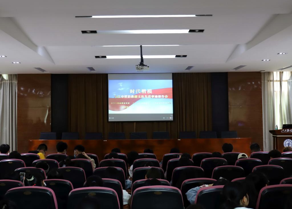 新闻中心讯 2020年8月31日,中共中央宣传部授予九江市消防救援支队“时代楷模”称号,褒扬他们是“水火见忠诚的英雄卫士”,号召全社会向他们学习。为充分发挥时代楷模榜样示范作用,常态化做好新时代先进人物进校园工作,10 月21日,省委宣传部、省委教育工委、省教育厅、省应急管理厅、省消防救援总队联合在南昌师范学院举办“时代楷模”进校园一一九江市消防救援支队先进事迹宣讲报告会。我校200多名师生在行政楼报告厅通过“赣教云直播平台”观看了报告会。
